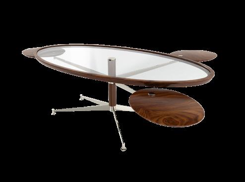 The Float Tray Table was originally designed for a ship’s cabin to act as both the coffee table and ottoman to the sofa. The upturned lip of the table top kept dishes from sliding off in rough seas.
