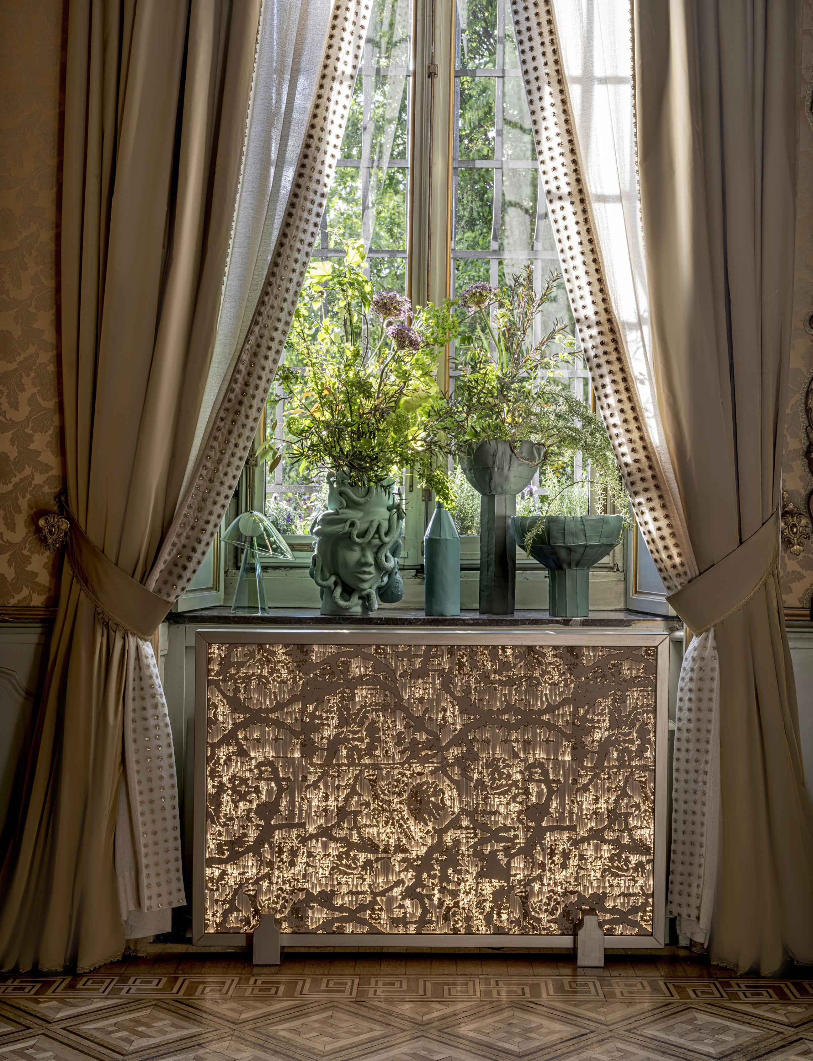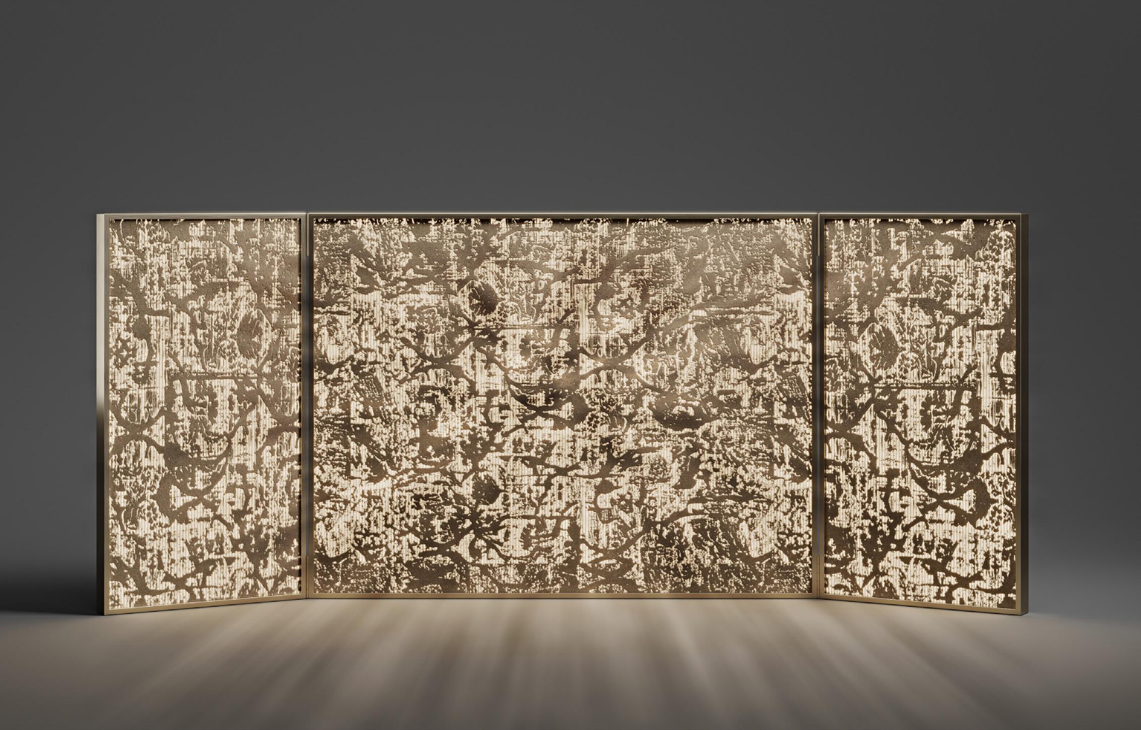 Elegant and multi-functional, the Luminosa Screen is comprised of a custom Italian Rubelli LED fabric inside a metal frame which rests within stone foot supports that can be positioned as needed along the base to accommodate unique installation sites. Originally designed as a radiant heating cover for l’Appartamento by Artemest at Milano Design Week 2024, the Luminosa Screen can also be used as a fireplace screen during summer months or made taller into a one, three or four-panel room divider. The Luminosa Screen provides privacy, concealment, and decoration by day, and with a flip of a switch by night, transforms the ambiance casting a warm glow through the textured fabric.