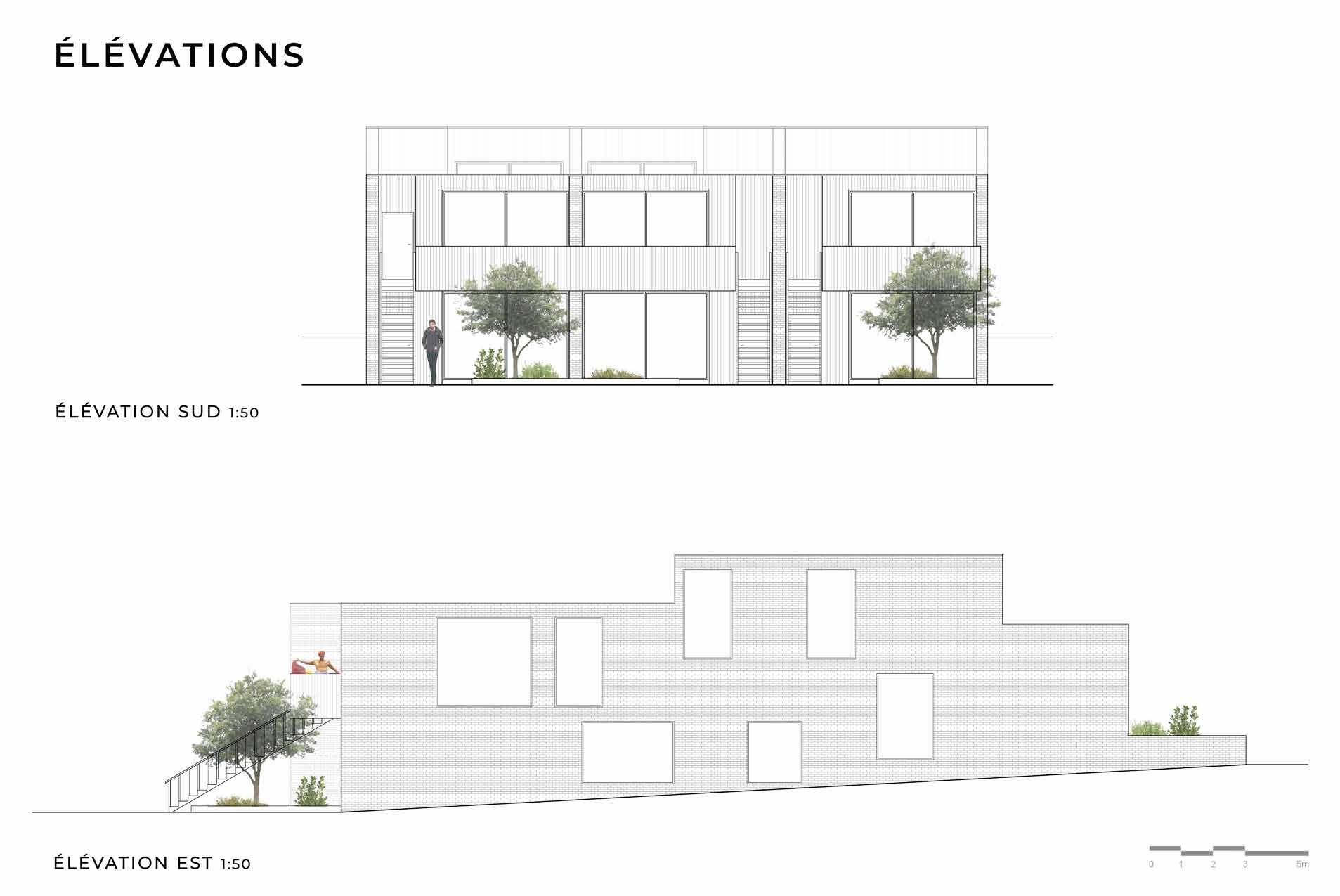 Chaque unité d’habitation comporte en fait deux logements. Un accessible à partir du rez-de-chaussée et se divisant sur un deuxième étage, puis un second indépendant accessible à partir d’un escalier extérieur. Cela permet de louer une partie de son logement à des locataires, d’avoir un bureau au-dessus de son logement ou d’avoir un logement intergénérationnel avec une même habitant toute l’unité. Nous avons chacun exploré un de ces scénarios pour ce projet.