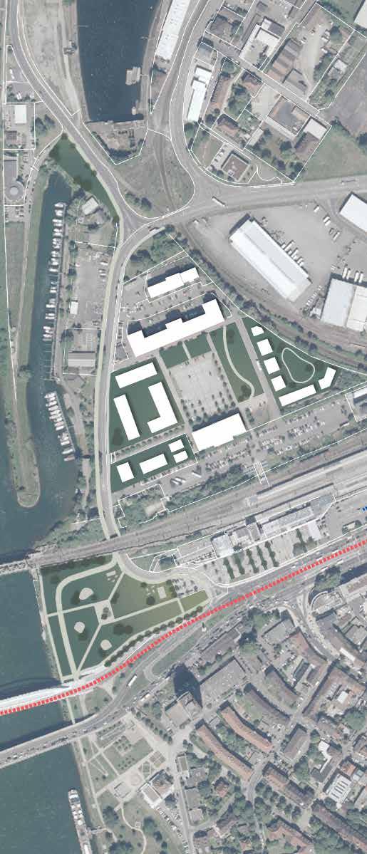 La route permettant le passage de Kehl à Strasbourg est désormais un boulevard urbain où la limite de vitesse est de 50 km/h à l’entrée de la ville. Au nord de ce boulevard, l’ancienne zone commerciale est transformée en quartier mixte afin de s’adapter aux besoins commerciaux et d’habitation changeants. Certains commerces, bureaux et habitations sont conservées sur le site puis, sur plus de 30 ans, les bâtiments se construiront peu à peu. La densité varie de 100 logts/ha à 50 logts/ha selon les îlots d’habitation. L’utilisation de la voiture est limitée à quelques rues et la vitesse varie entre 30 km/h et 10 km/h. Le reste des circulations est accessible à pied ou à vélo. Ce nouveau quartier amène presque 1300 nouveaux logements et est desservi par le TLG.