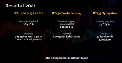 I 2021 kom RT1 København, RT 100 Østerbro, RT132 Christianshavn og RT133 Sydkysten med. De 5 klubber indsamlede i 2021 til sammen 356.191 kr., der blev brugt til at købe julegaver til over 800 danske børn i familier med hver deres triste historie, og hver deres årsager til, at de havde behov for julehjælp.