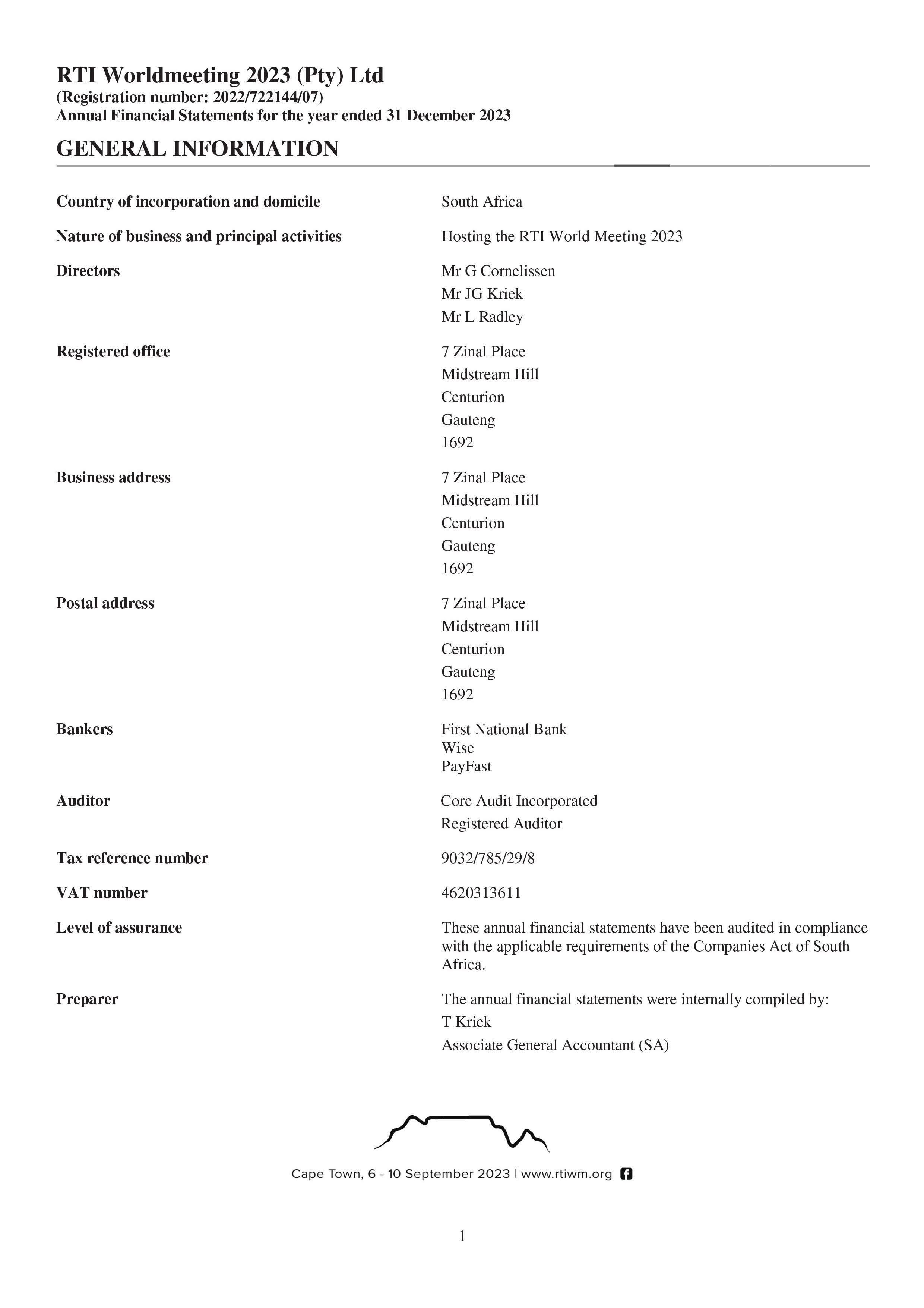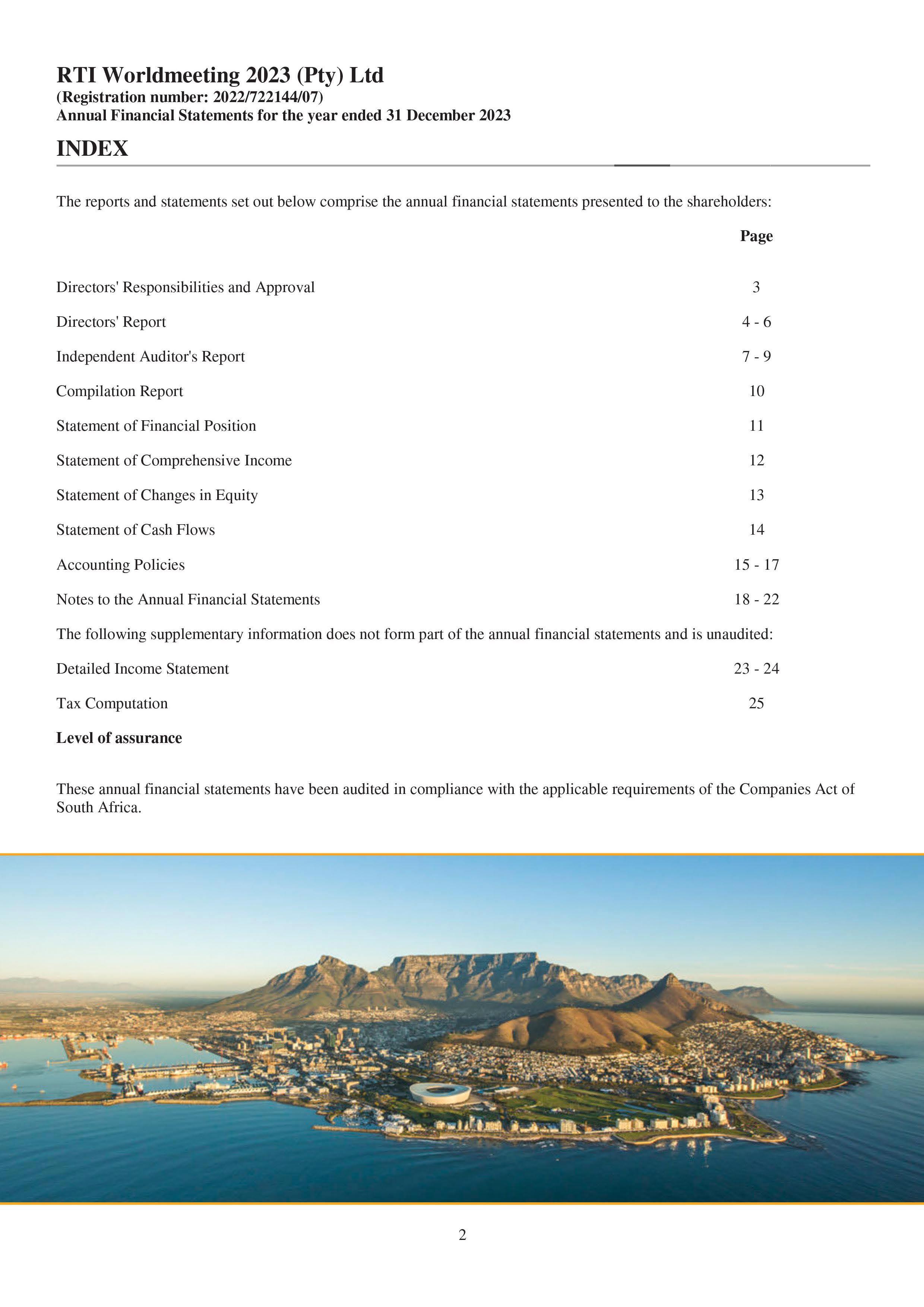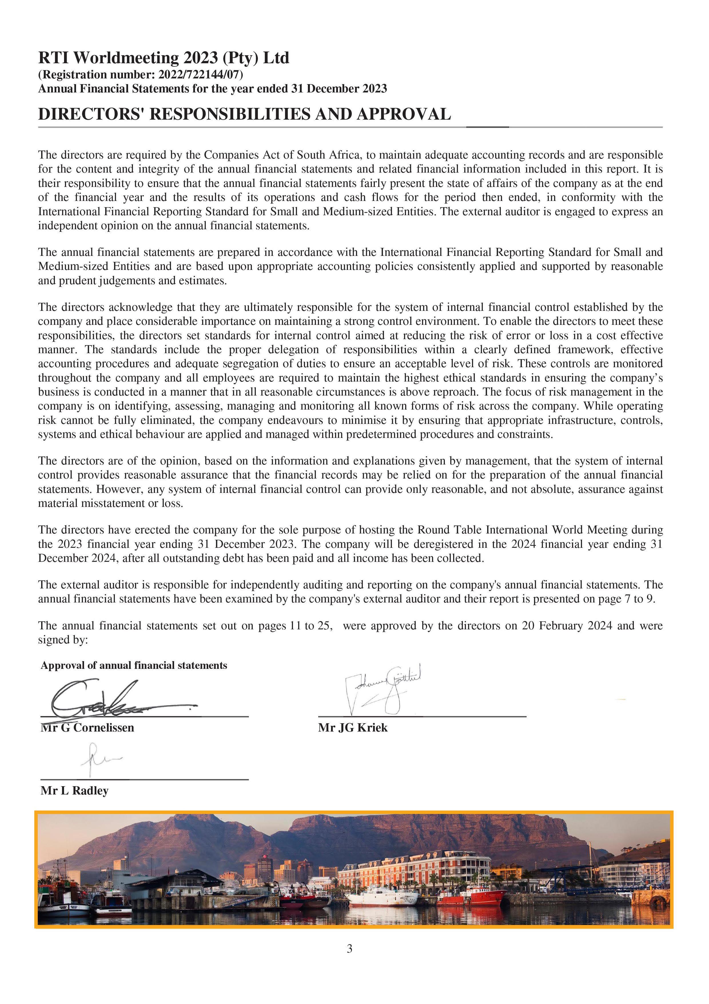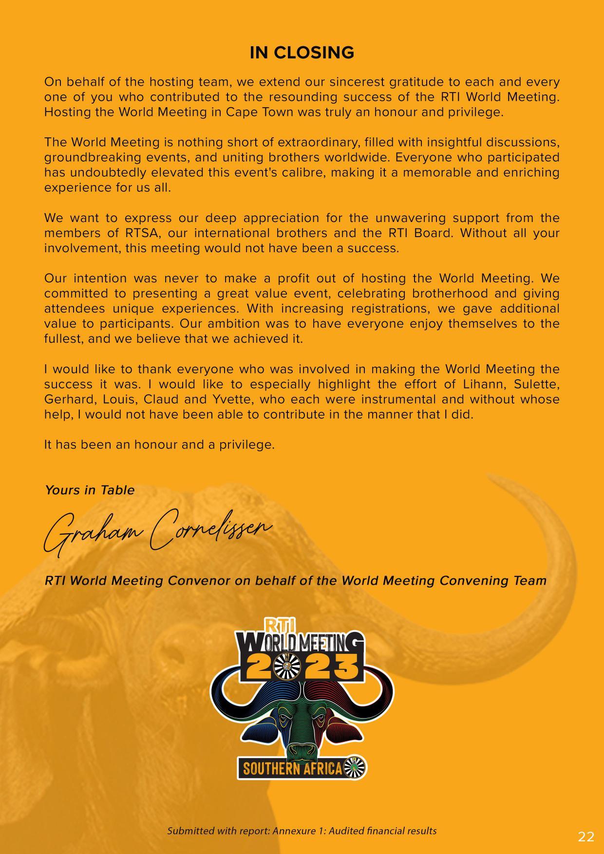 president@roundtable.co.za C2 General 10 Obituaries 11 Correspondence 12 Approval of the Minutes of the 72nd Annual General Meeting 13 Matters Arising from Previous Minutes 14 Placement of New Matters on the Agenda 15 Constitutional Rules 15.1 Motions 16 Presentation of Nominated Association Alignment Projects 17 Vice President’s Membership and Extension Report 18 Executive Council Reports 18.1 RTSA International Relations Officer 18.2 RTSA Branding and Strategic Planner 18.3 RTSA Secretary 18.4 RTSA Communication office and Inkundla Editor 18.5 RTSA IPP/ Constitutional Advisor & EXCO 1 19 Treasurer 19.1 Adoption of Audited Financials for 2023/2024 19.2 Financial Recommendations for 2024/2025 19.3 Adoption of the Proposed Budget for 2024/2025 19.4 Round Table Trust (Dr David Smith Trust) 20 RTI World Meeting 2023 Convener 20.1 RTI WM Audited Financials 20.2 RTI World Meeting Convener Report 21 ARTSA Annual General Meeting Reports 21.1 ARTSA 2024 Convener 21.2 ARTSA 2025 Presentation 22 RTSA President’s Report 23 General Page 5