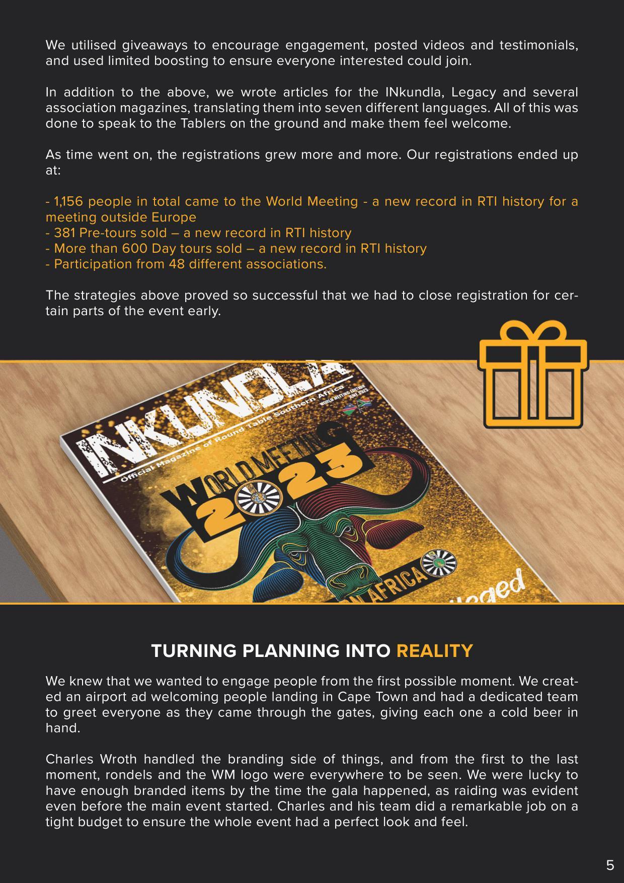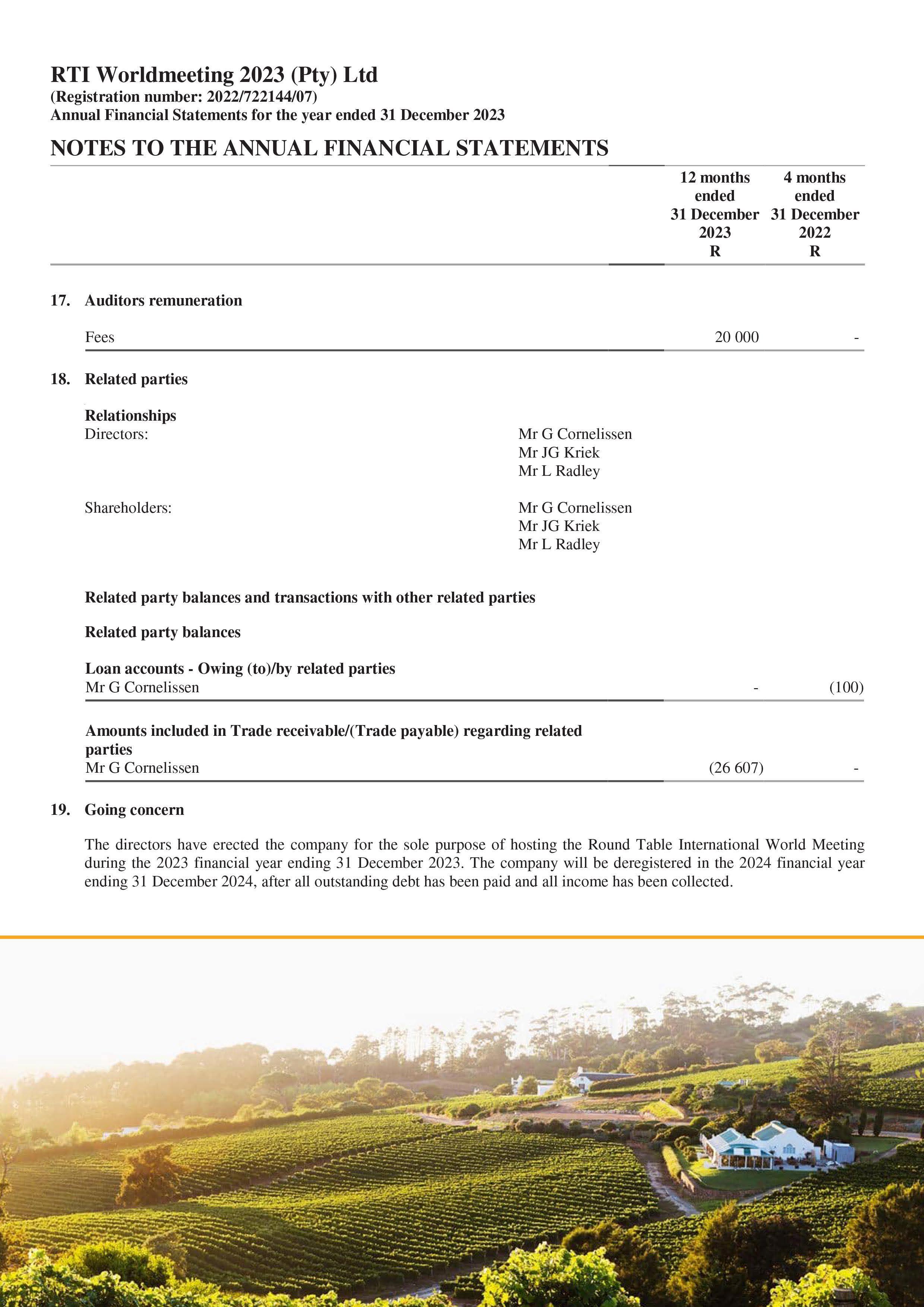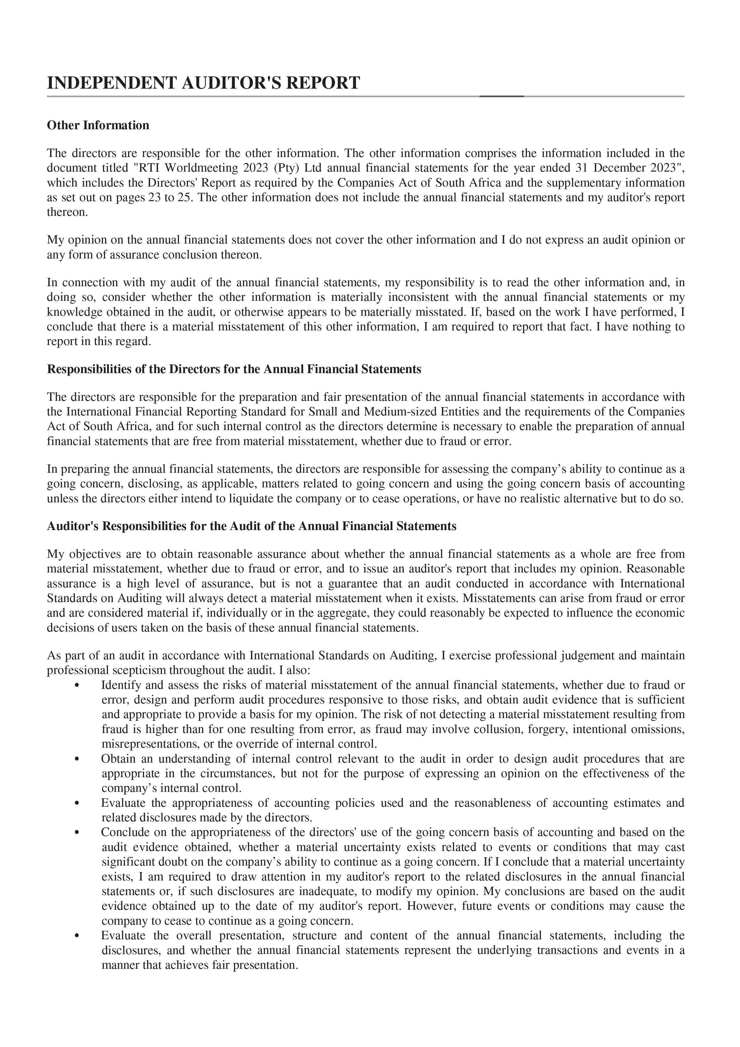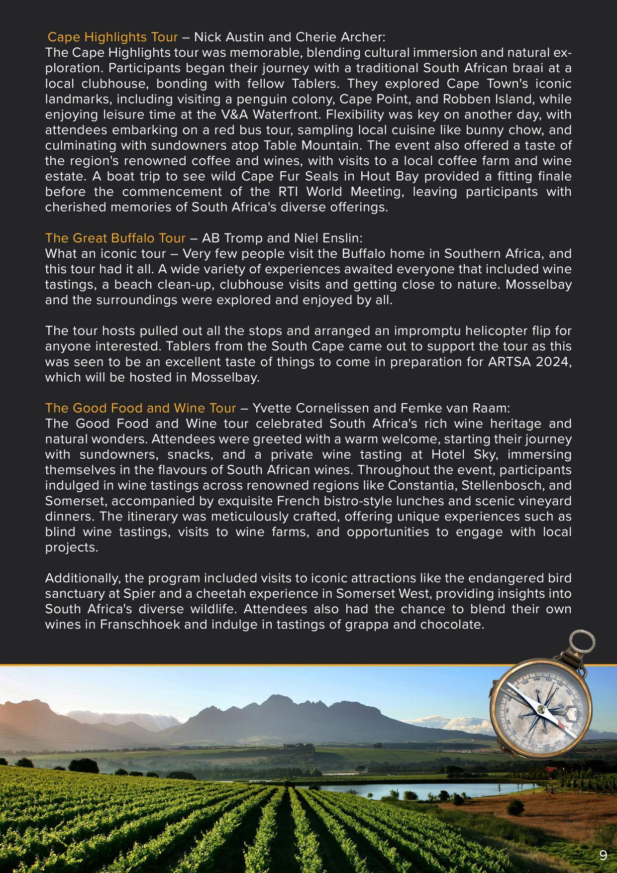 president@roundtable.co.za C2 General 10 Obituaries 11 Correspondence 12 Approval of the Minutes of the 72nd Annual General Meeting 13 Matters Arising from Previous Minutes 14 Placement of New Matters on the Agenda 15 Constitutional Rules 15.1 Motions 16 Presentation of Nominated Association Alignment Projects 17 Vice President’s Membership and Extension Report 18 Executive Council Reports 18.1 RTSA International Relations Officer 18.2 RTSA Branding and Strategic Planner 18.3 RTSA Secretary 18.4 RTSA Communication office and Inkundla Editor 18.5 RTSA IPP/ Constitutional Advisor & EXCO 1 19 Treasurer 19.1 Adoption of Audited Financials for 2023/2024 19.2 Financial Recommendations for 2024/2025 19.3 Adoption of the Proposed Budget for 2024/2025 19.4 Round Table Trust (Dr David Smith Trust) 20 RTI World Meeting 2023 Convener 20.1 RTI WM Audited Financials 20.2 RTI World Meeting Convener Report 21 ARTSA Annual General Meeting Reports 21.1 ARTSA 2024 Convener 21.2 ARTSA 2025 Presentation 22 RTSA President’s Report 23 General Page 5