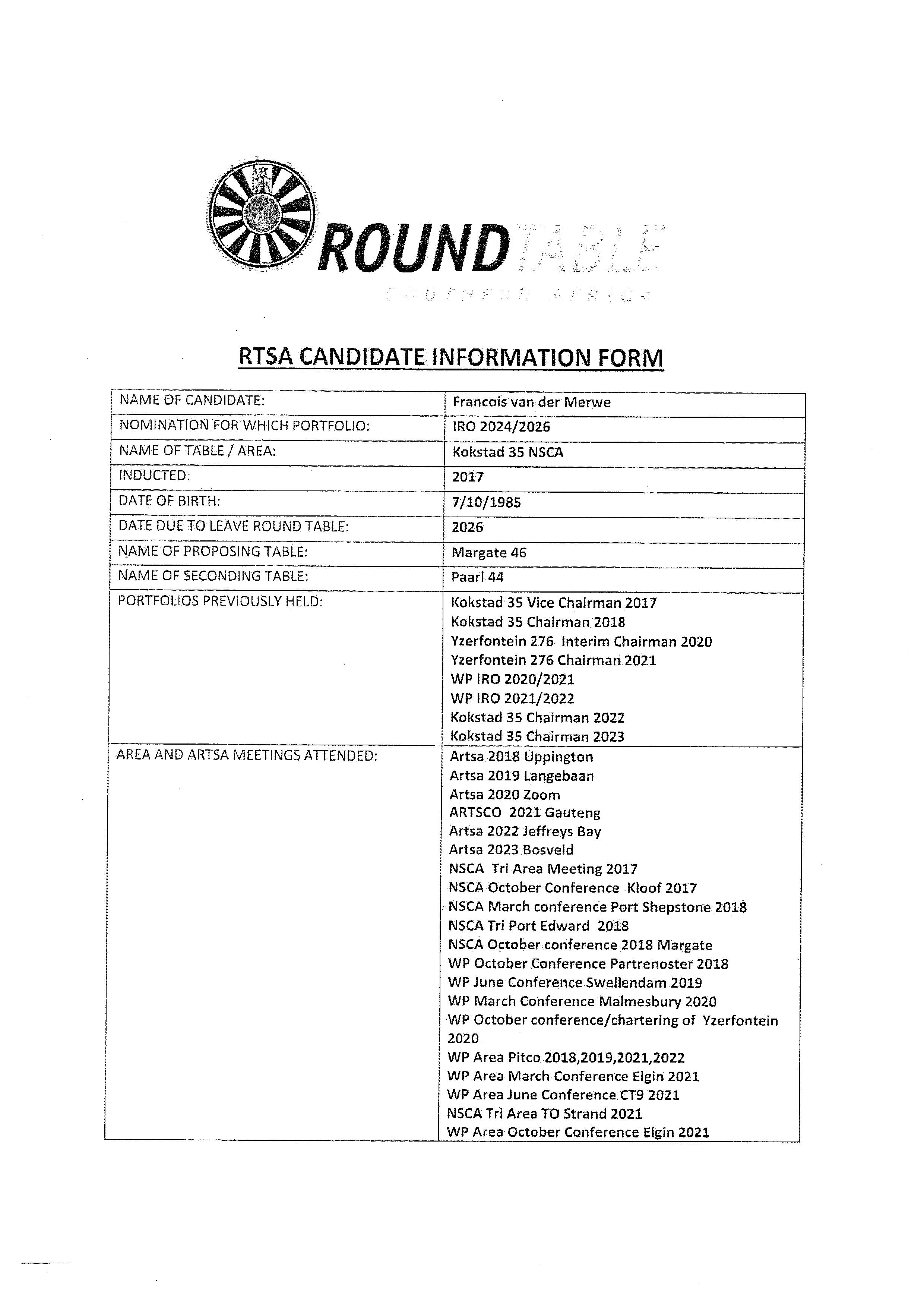 As a candidate for Vice President of Round Table Southern Africa, I am committed to ensuring that our organisation continues promoting the values above-mentioned but also making sure there is an organisation that our kids come back to. I am here to serve our members. Our members are our assets, and I am here to make sure that we look after ourselves and our members.