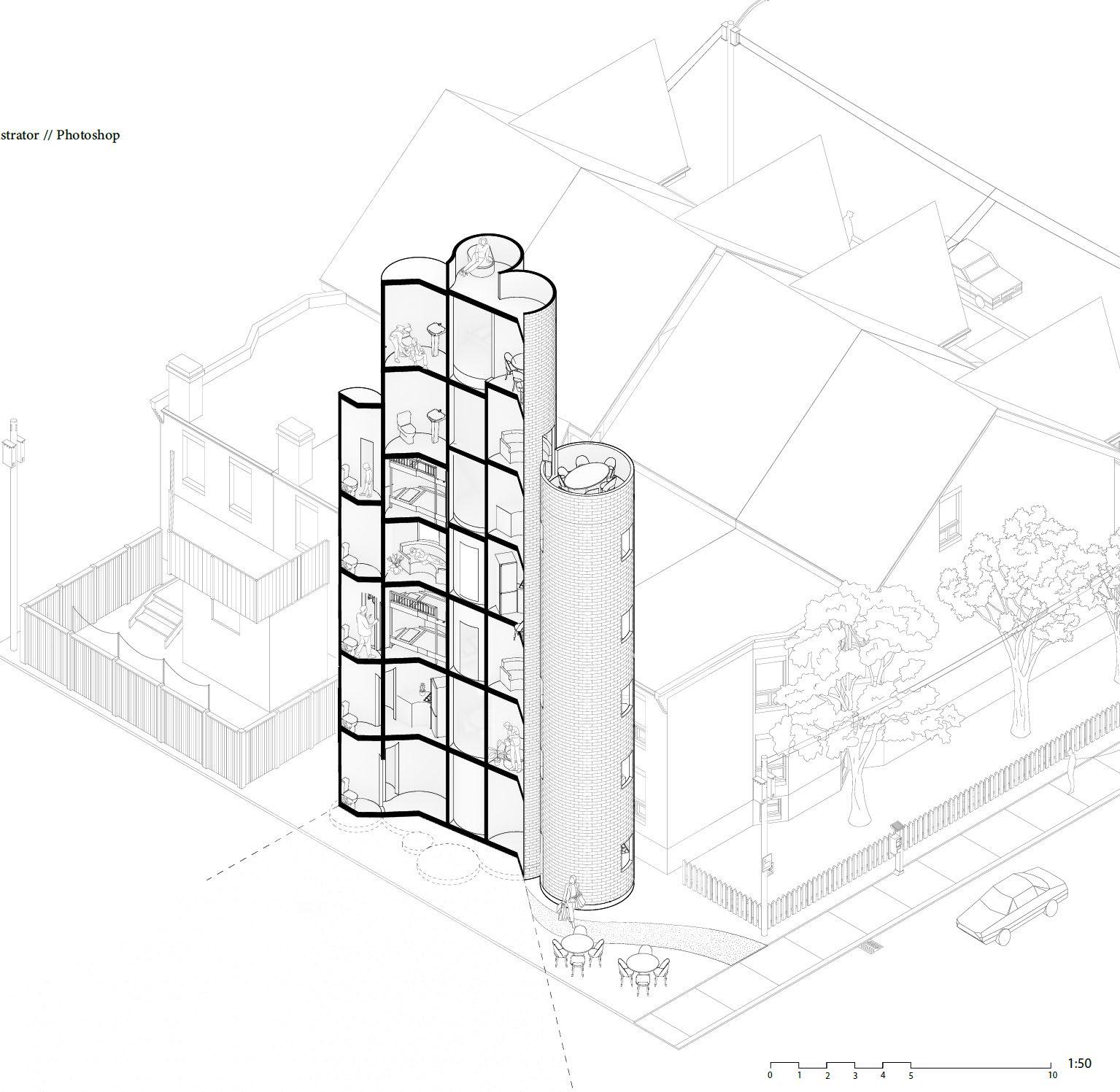 The circular brick façade of my mixed-use development wraps the building in a cohesive and rhythmic form, inspired by the geometric precision of the Okamura House. Towering above the vibrant, tightly knit two-story streetscape of Toronto’s Kensington neighborhood, the building emerges as a striking vertical landmark. Its bold height contrasts sharply with its surroundings, yet it thoughtfully integrates into the eclectic urban fabric, respecting the area’s character while introducing a modern and dynamic presence.