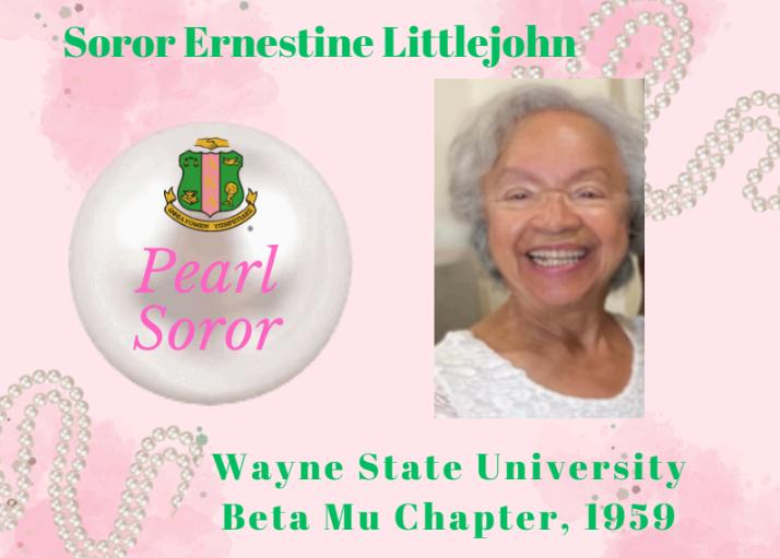 ThreeillustriousPearlSororswere recognizedfor65yearsofmembershipin AlphaKappaAlphaSorority,Inc®. SororLaVerneBrown,initiatedinthe BetaPiChapteratAlabamaState University;SororErnestineLittlejohn, initiatedintheBetaMuChapteratWayne StateUniversity;andSororIreneOutlaw, initiatedintheAlphaIotaChapterat LincolnUniversity.Eachofthembecame membersofourbelovedsisterhoodin 1959.