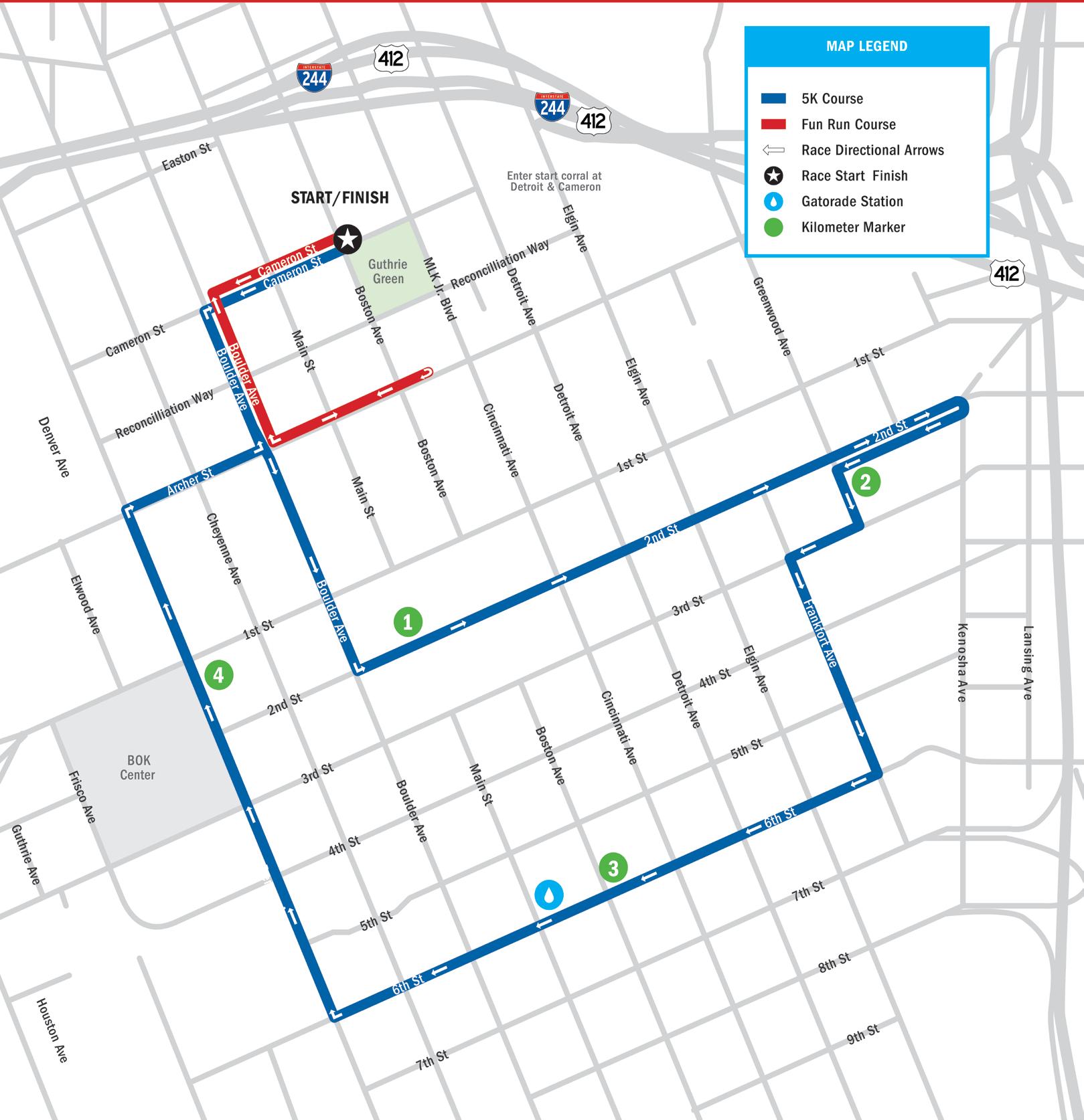 All Sunday races start at 8 am between 9th & 10th and Main Streets in downtown Tulsa and finish at Guthrie Green in the Tulsa Arts District.