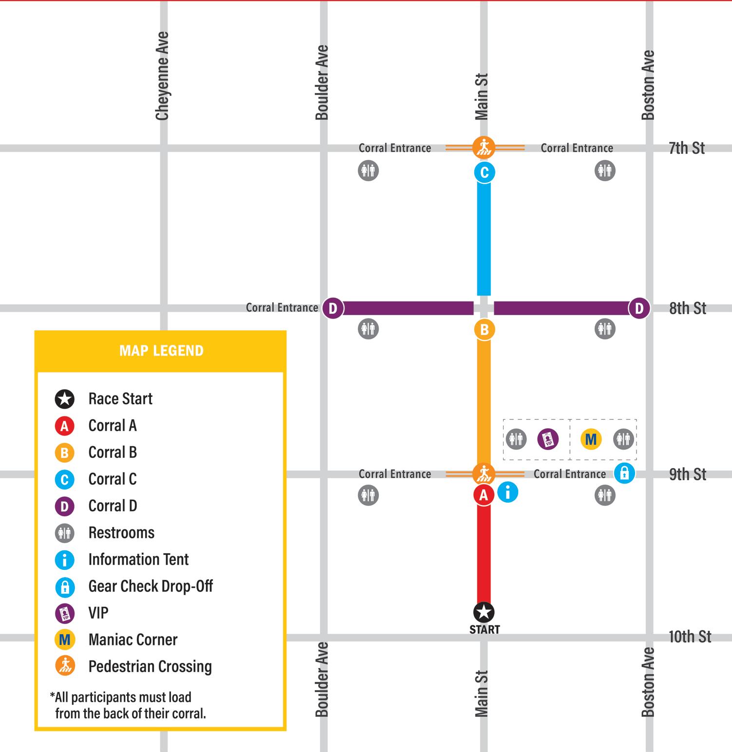 • What better place to feel the excitement and electricity in the air than at the starting line? Hear the national anthem and watch the confetti fly as participants begin their journeys on the course. The start line is located in downtown Tulsa at 9th & 10th and Main Streets.