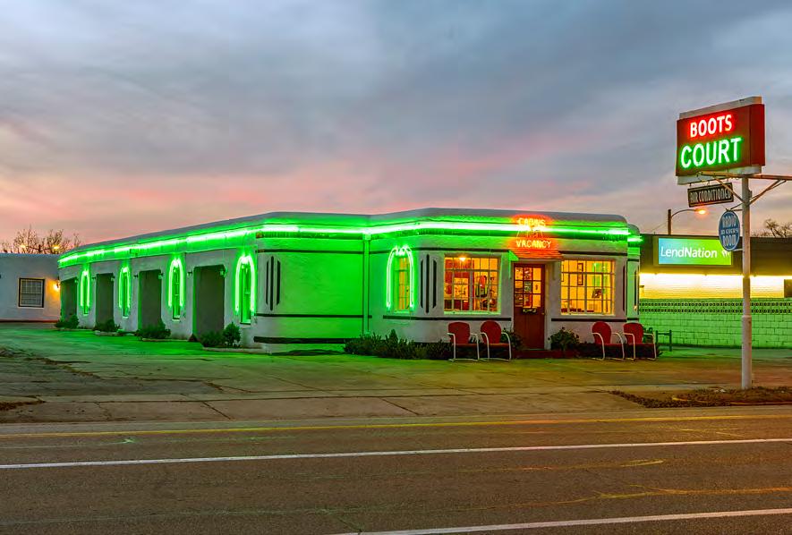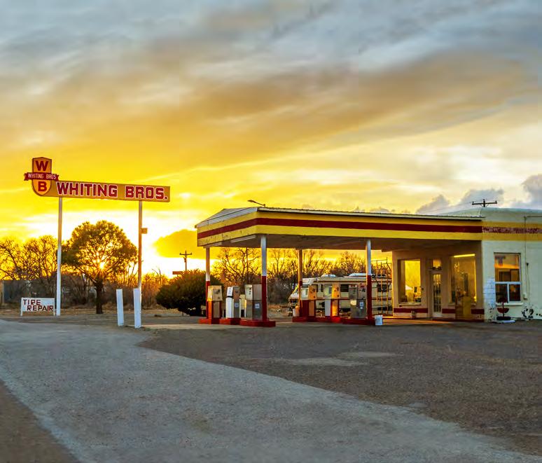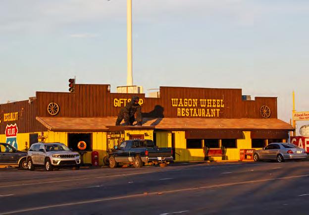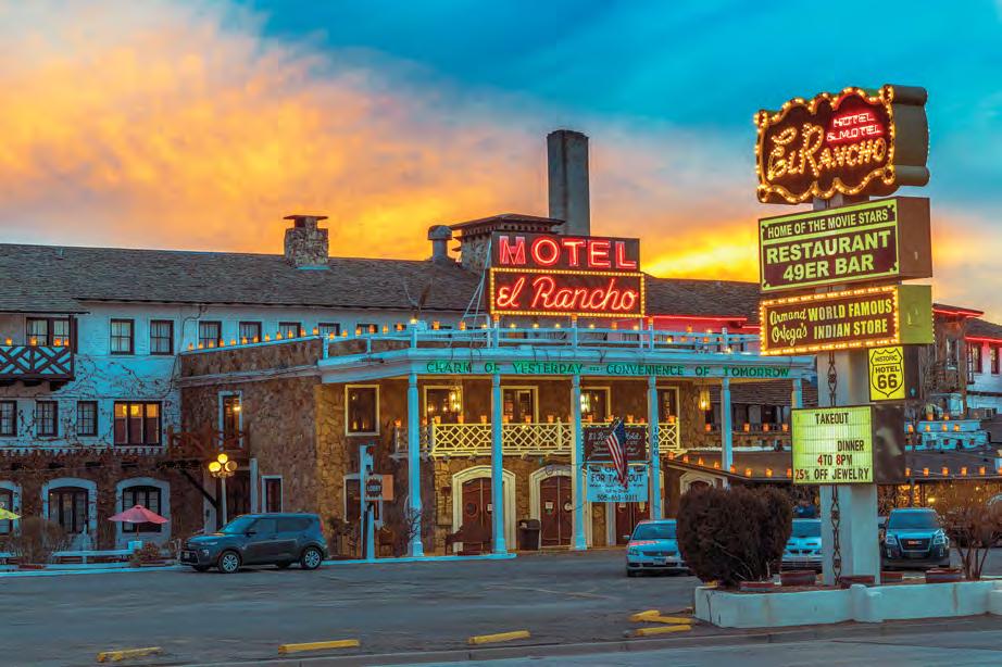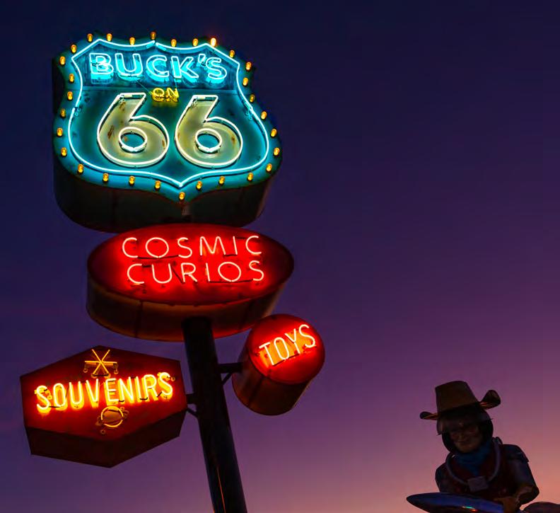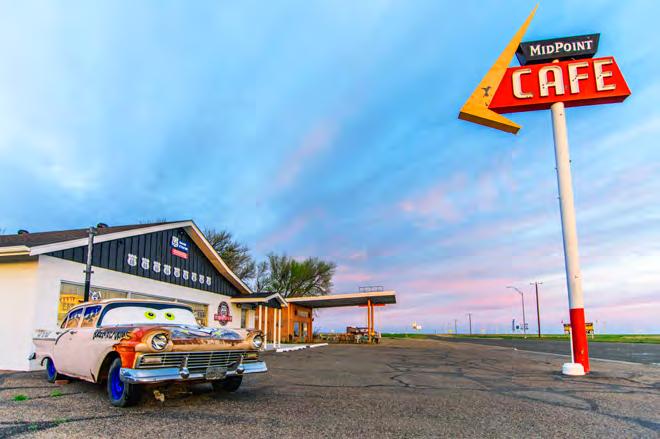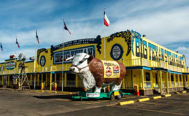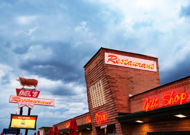 Stop in Tucumcari’s legendary Del’s Restaurant, a Mother Road classic since 1956! Still rocking its original flagstone floors, Del’s serves up a mouthwatering Mexican American fusion with that warm Southwestern hospitality everyone loves. The neon Hereford bull sign? Iconic. Inside, the atmosphere is lively, sprinkled with Old West and Route 66 memorabilia that make every meal a mini history lesson. From a sprawling salad bar to hearty steaks, seafood, pasta, and classic Mexican favorites, there’s something for every craving. And yes, the portions don’t disappoint. With roots tracing from Del and Wilma Akin to former teen-employeeturned-owner Chase Waters, Del’s has heart, history, and flavor. Tip: Get here early or snag a spot on the spacious patio to watch Route 66 roll by.