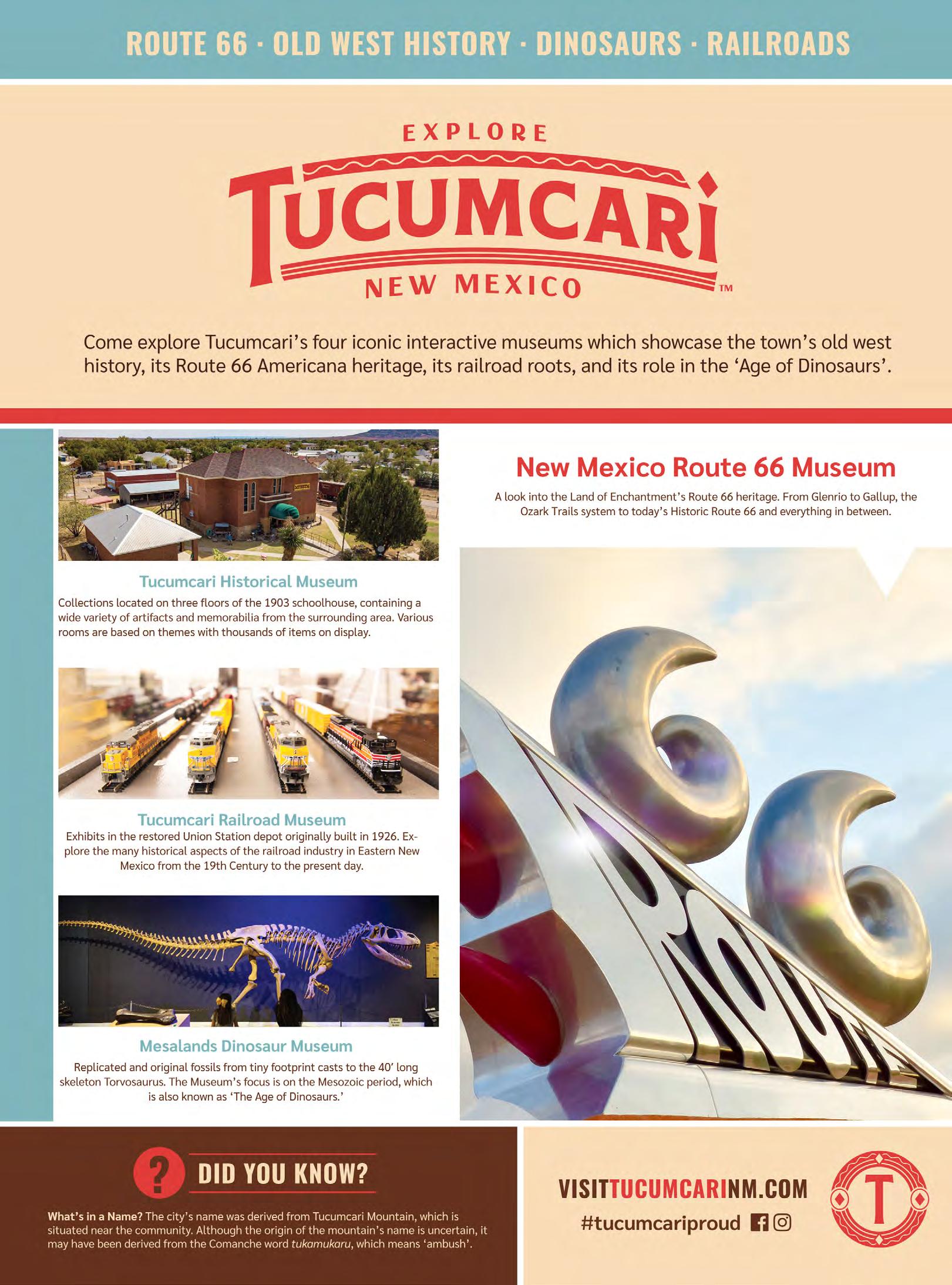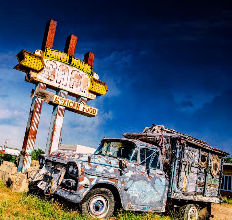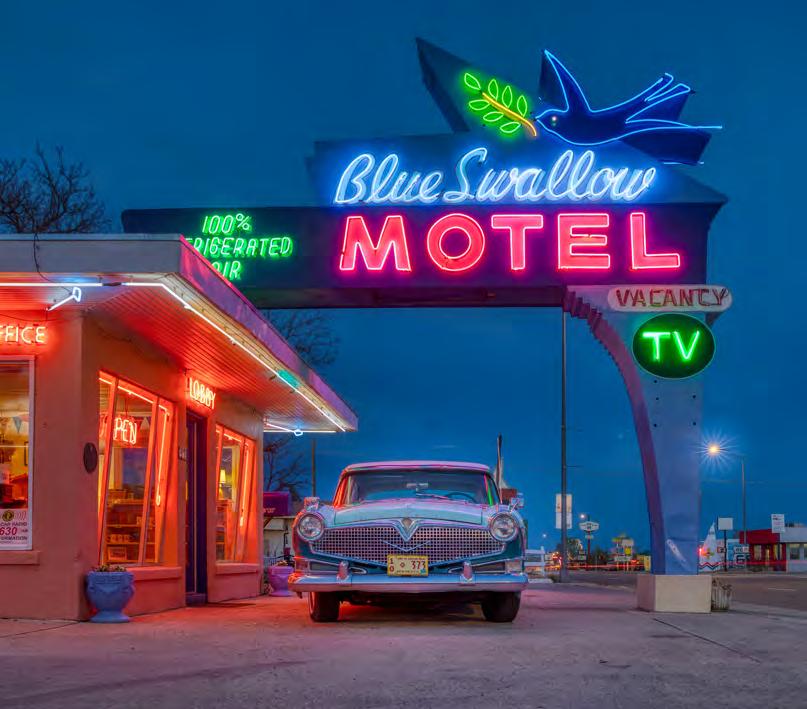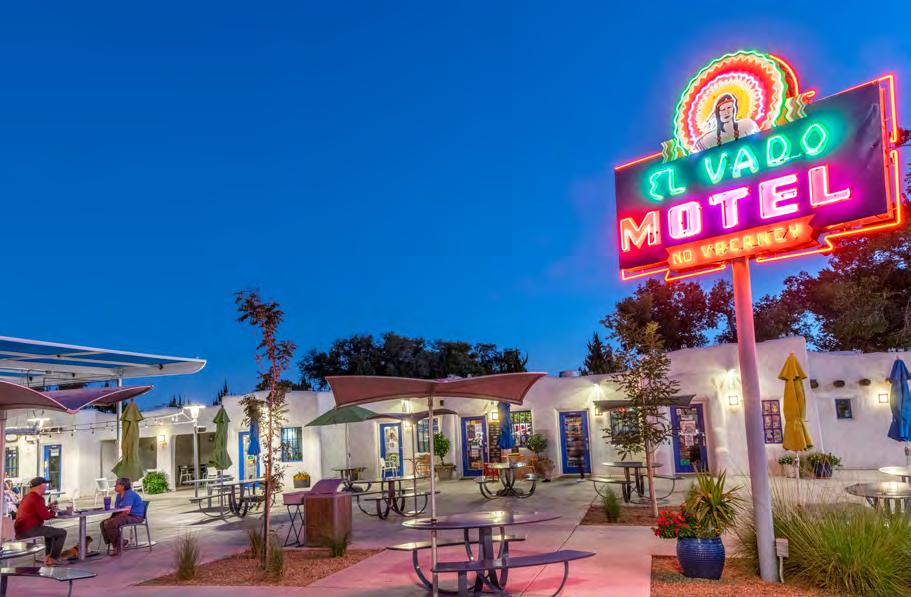 Stop in Tucumcari’s legendary Del’s Restaurant, a Mother Road classic since 1956! Still rocking its original flagstone floors, Del’s serves up a mouthwatering Mexican American fusion with that warm Southwestern hospitality everyone loves. The neon Hereford bull sign? Iconic. Inside, the atmosphere is lively, sprinkled with Old West and Route 66 memorabilia that make every meal a mini history lesson. From a sprawling salad bar to hearty steaks, seafood, pasta, and classic Mexican favorites, there’s something for every craving. And yes, the portions don’t disappoint. With roots tracing from Del and Wilma Akin to former teen-employeeturned-owner Chase Waters, Del’s has heart, history, and flavor. Tip: Get here early or snag a spot on the spacious patio to watch Route 66 roll by.
