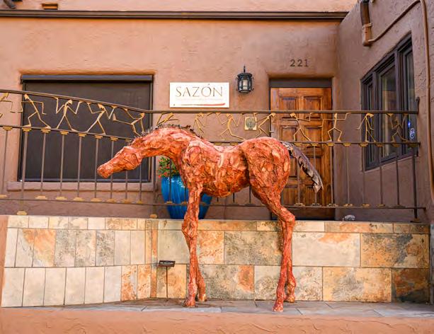 Sazón’s tan adobe facade is just the start. Inside, exposed dark wood beams, soft lighting, and bold life-size Mexican artwork set the scene for an Instagram-worthy experience. Chef and owner Fernando Olea, a Mexico City native, has been shaping Santa Fe’s culinary scene since 1991, bringing traditional Mexican flavors and Old Mexico’s indigenous culinary traditions to a fine-dining stage. Every detail feels curated, from the whimsical purse pedestal to the perfectly choreographed plate clearing. The menu is deliberately small but elevated: five signature moles with mini tortillas, plus a rotating meat, fish, and vegetarian dish. Don’t miss Dulce Sinfonía, his showstopping layered dessert. Every bite is an experience, every moment intentional. You’ll be raving, sharing, and already planning your return.