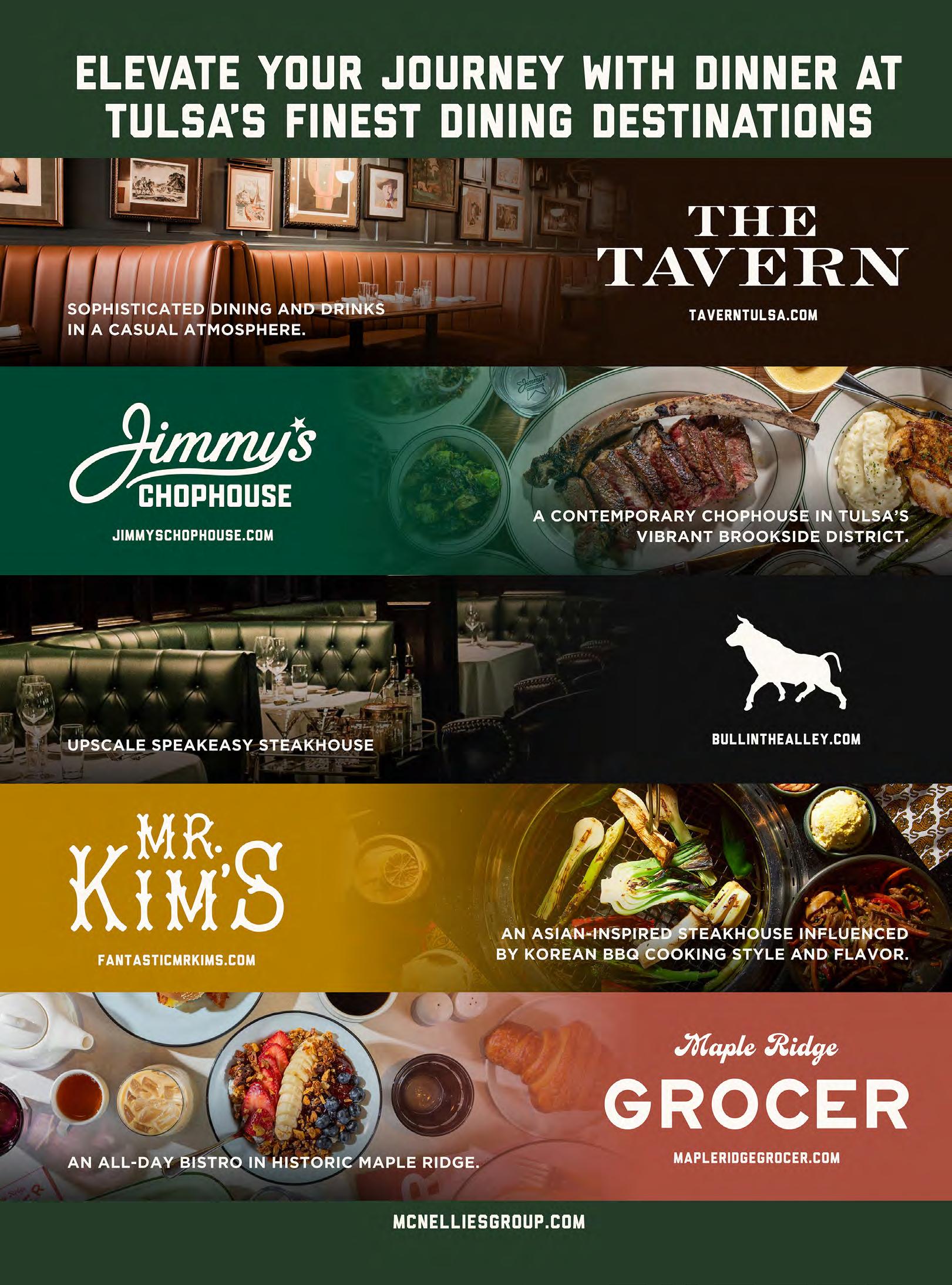 Oklahoma knows steak, and Mahogany Prime Steakhouse proves it. Since opening in ’86 under Hal Smith, this celebrated spot has been serving perfectly cooked, custom-aged U.S. Prime Midwestern beef with flair. Steaks broiled to lock in corn-fed flavor arrive sizzling on heated plates, paired with sides that hit just right. Local ingredients and communityfocused sustainability take center stage, making every steak feel connected to the source. Classy yet approachable, it’s the kind of place where the food and service are worth dressing up for. With a sleek, beautiful interior, attentive servers who know their stuff, a stellar wine list, and valet parking, you’ve got a prime night out. If steak is your love language, this is your spot.