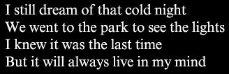 ‘'Iamthelastpasserbyonthislongstreet Icamelatetoleaveearly,don’tholdontomyvoice Oneday,inthesparkleofyoureyes,Iwillfindthe sun