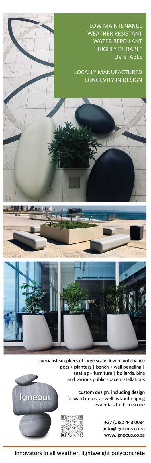 144 The Friendly Plant: Turning unused spaces into dream gardens 150 West End Office Park 154 Casa á Beiramar 160 La Cantina at Fancourt 164 Widenham Retirement Village: Top tips for securing the perfect retirement home