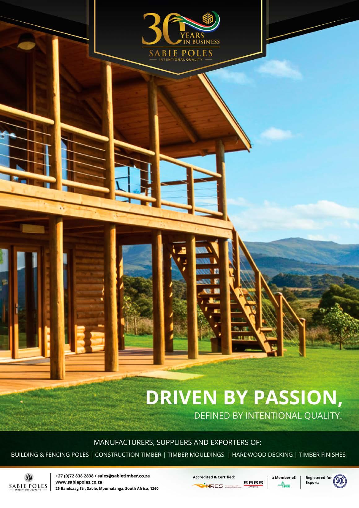 For more information, visit www.sabiepoles.co.za, call or WhatsApp 072 838 2838, or email sales@sabietimber.co.za. Visit us at our plant: 25 Bandsaag St, Sabie, Mpumalanga, South Africa, 1260. ■