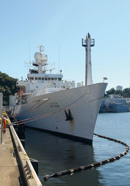 survey ship, or T-AGS, pronounced “tags”. “These ships are always forward deployed,” Captain Wallace explained of the specialized data collection vessels that rank as some of the busiest in the Navy. They collect a wide spectrum of oceanographic data, including CTD (conductivity, temperature, and depth) and a number of other criteria. Wallace explained that these ships scan columns of ocean water from the seafloor to the surface, and the data collected is then fed into computers at FNMOC. Survey detachments travel throughout the globe, often battling extreme ocean conditions. “They are out there fighting heavy seas, in places where no other ships go, in inclement weather, so we understand and characterize a very complex ocean environment”.