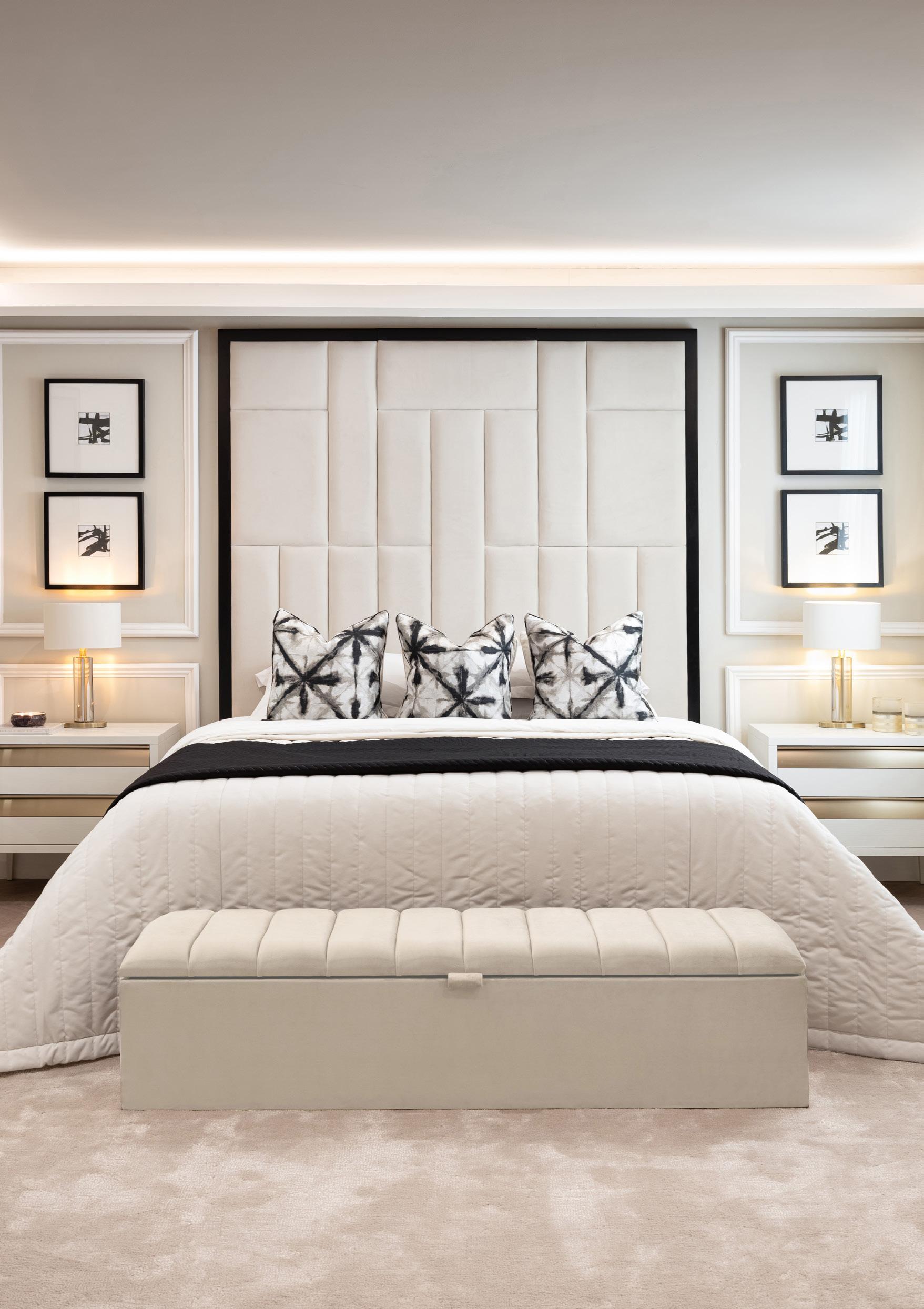 Monochrome Art Set of 2, £119.00 | Hugo Black Quilted Bedspread, from £44.00 | Arizona Black & Grey Print Cushion - 50 x 50cm, £44.00 | Kensington Cream Panelled Ottoman Box, from £369.00 | Kensington Cream Premium Headboard with Wooden Frame (opposite), from £1,299.00