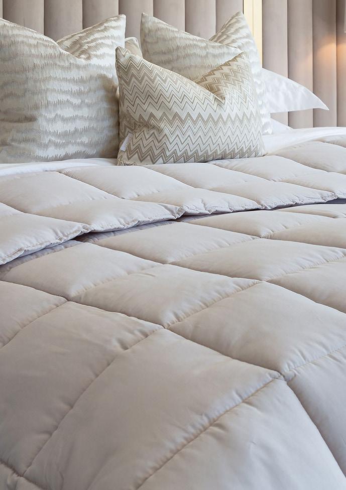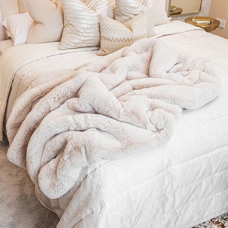 Serenity Champagne 100% Cotton Quilted Bedspread (opposite), from £79.00 | Arizona Cream & Nude Print Bolster Cushion, from £29.00 | Lili Extra Thick Faux Fur Oatmeal Throw, from £99.00 | Braelyn Ivory & Taupe Abstract Rug, from £299.00 | Serena Silk Satin Cushion, £64.00