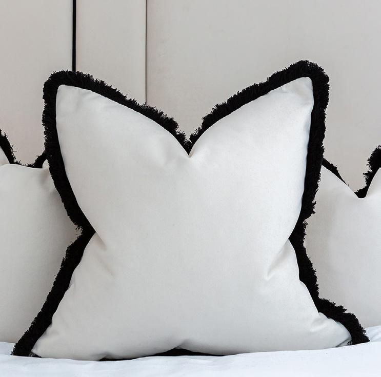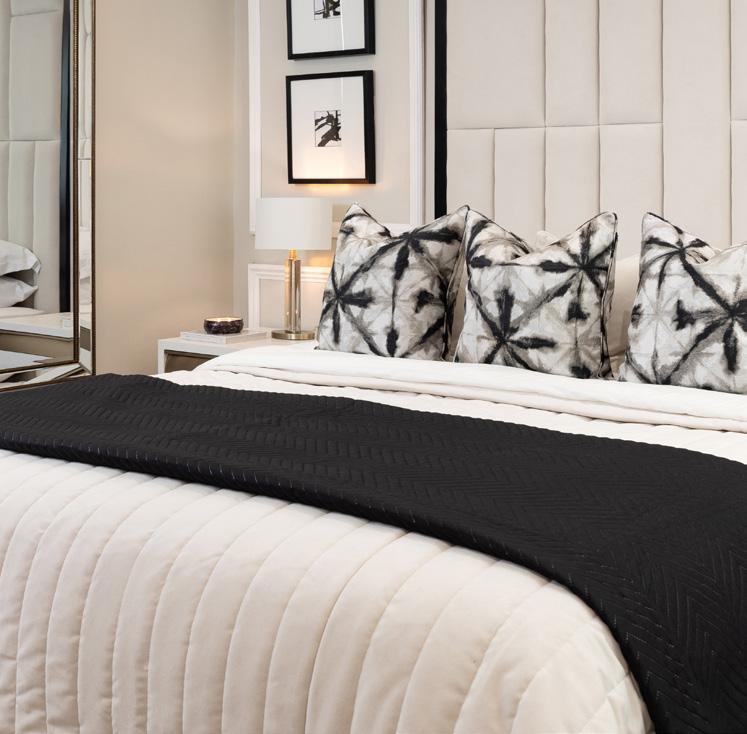 Ari Cream Velvet Cushion with Black Fringe Detail 50x50cm, £49.00 | Arizona Black & Grey Print Bed Runner, £139.00 | Knightsbridge Cream Velvet Accent Chair With Black Piping, £749.00 | Iris Oatmeal