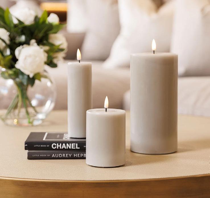 Cream Realistic LED Candle - 20cm, £32.00 | Lunar Oyster Individual Headboard Panel - 45cm, £139.00 | Lili Extra Thick Faux Fur Oatmeal Throw, £99.00 | Valentina Oyster & Gold Channelled Headboard (opposite), from £1,399.00