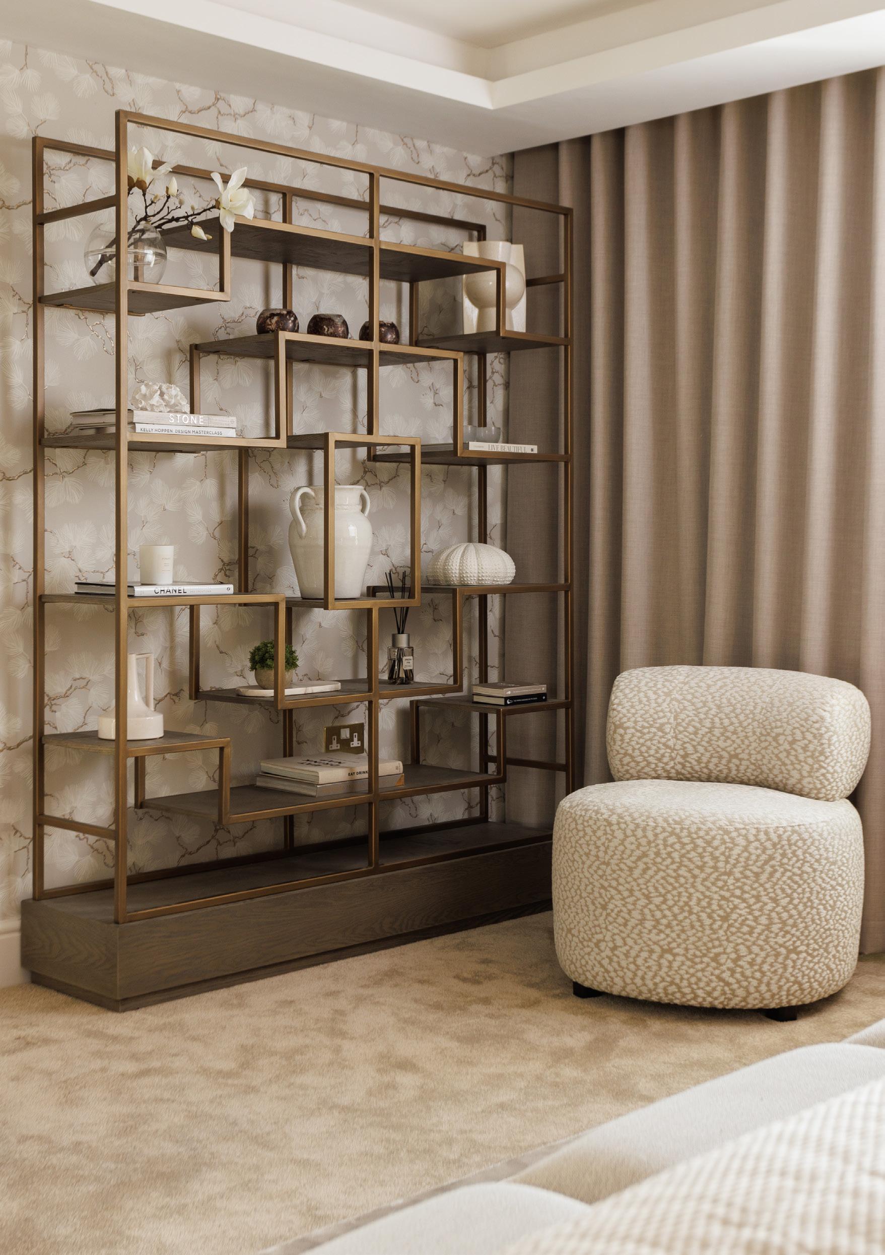 Haye Chestnut Oak Veneer & Gold Large Display Unit (opposite), £2,099.00 | Carmen Beige & White Patterned Accent Chair (opposite), £799.00 | Tribeca Large Warm Grey Left Hand Facing Sofa, from £3,099.00 | Paddington Premium Nest of 2 Side Tables, £799.00 | Warm Grey Realistic LED Candle - 20cm £32.00