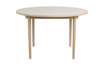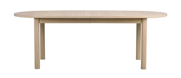 Solid European oak throughout the product. Top in finger jointed solid oak, legs and apron in full length lamellas solid oak. Possibility to store insert leaves in the dining table