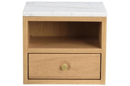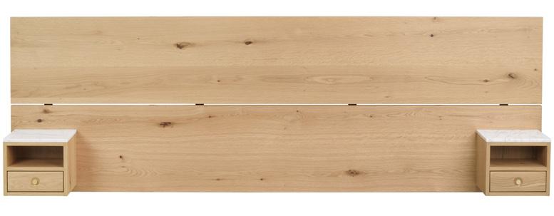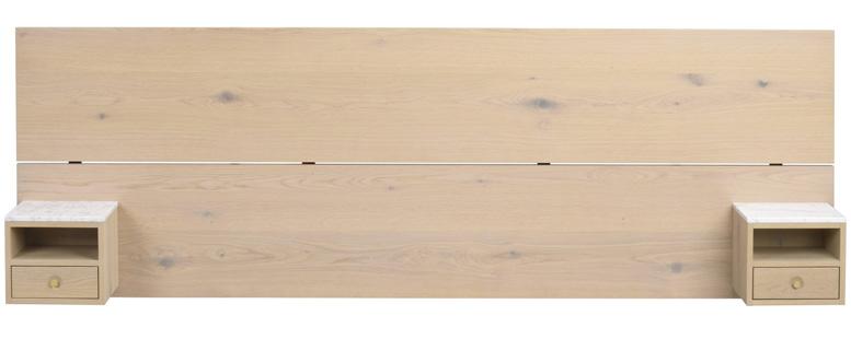 Headboard in wild oak veneer on MDF with solid oak edges. Bedside tables in oak veneer on MDF. Front of drawer in solid oak, inner drawer in hardwood, drawer sliders in metal and top in white marble. Adjustable legs in metal.