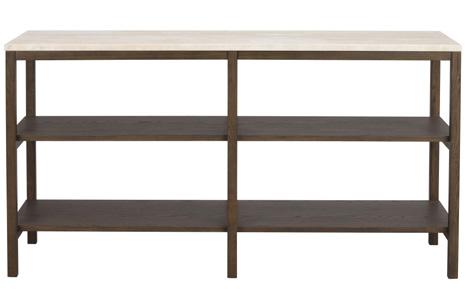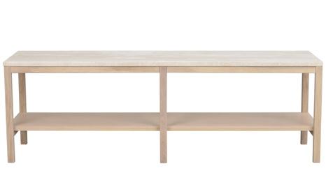 Solid genuine Italian Travertine stone in top, legs and frame in solid oak, shelves in MDF with oak veneer.