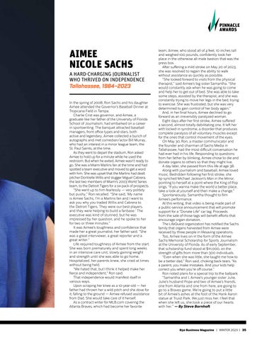 team, Aimee, who stood all of 4 feet, 10 inches tall and weighed 100 pounds, confidently took her place in the otherwise all-male bastion that was the press box. After suffering a mild stroke on May 20 of 2023, she was resolved to regain the ability to walk without assistance as quickly as possible. “She looked forward to visits from the physical therapist,” said Aimee’s big sister Samantha. “She would constantly ask when he was going to come and help her to get out of bed. She was able to take some steps, assisted by the therapist, and she was constantly trying to move her legs in the bed, trying to exercise. She was frustrated, but she was very determined to gain control of her body again.” And, in her final hours, Aimee declined to go forward as an irreversibly paralyzed woman. Eight days after her first stroke, Aimee suffered a second, almost totally debilitating one. It left her with locked-in syndrome, a disorder that produces complete paralysis of all voluntary muscles except for the ones that control movement of the eyes. On May 30, Ron, a master communicator and the founder and chairman of Sachs Media in Tallahassee, had the most difficult conversation he had ever had in his life. Responding to questions from her father by blinking, Aimee chose to die and donate organs to others so that they might live. A day later, she passed from this life at age 38. Along with journalism and baseball, Aimee loved music. Bedridden following her first stroke, she lip-synched Michael Jackson’s Man in the Mirror, pointing to herself at a point where the King of Pop sings, “If you wanna make the world a better place, take a look at yourself and then make a change.” Spontaneously, Samantha thought to film Aimee’s performance. At this writing, that video is being made part of a public-service announcement that will promote support for a “Donate Life” car tag. Proceeds from the sale of those tags will benefit efforts that encourage organ donation. The LifeQuest organization has notified the Sachs family that organs harvested from Aimee were received by three people in lifesaving operations. Too, Aimee lives on in the form of the Aimee Sachs Memorial Scholarship for Sports Journalism at the University of Florida. As of early September, that scholarship fund stood at $111,000, on the strength of gifts from more than 300 individuals. “Even when she was little, she taught me how to be a better dad,” Ron said, choking back tears. “As a parent, you make mistakes. And your kids help correct you when you’re off course.” Ron noted plans for a special trip to the ballpark. “Samantha and I, Aimee’s younger sister Julie, Julie’s husband Pope and two of Aimee’s friends, one from Atlanta and one from here, are going to go to a Braves game. We’re going to put a little bit of Aimee’s ashes at the foot of the Hank Aaron statue at Truist Park. We just miss her. I feel that when she left us, she took a piece of our hearts with her.” — By Steve Bornhoft