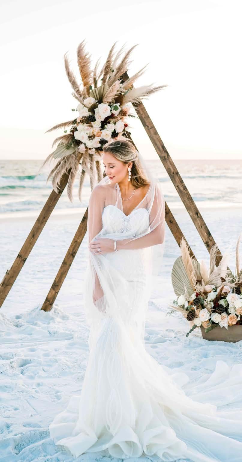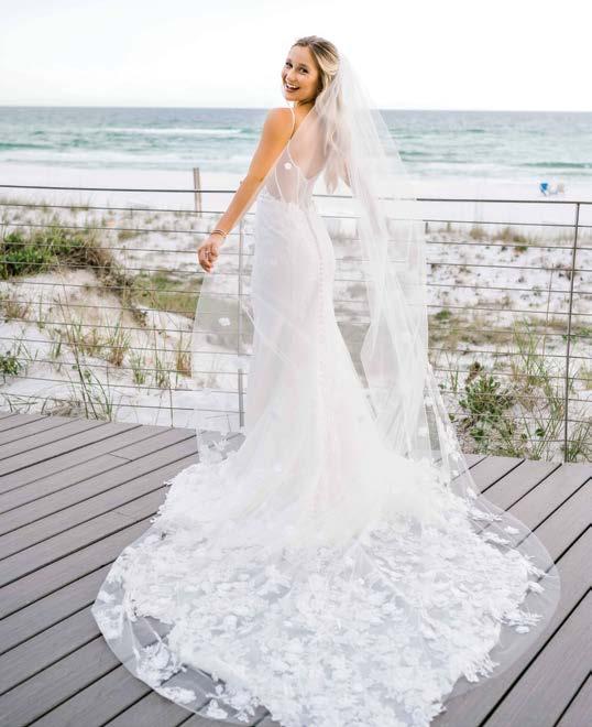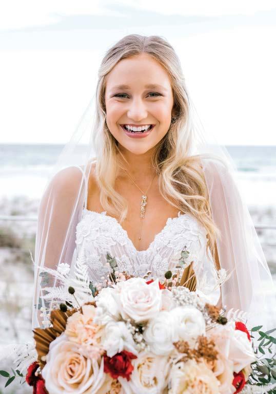 This cover holds a special place in our hearts as it’s Northwest Florida Weddings Magazine’s first styled cover shoot. Our cover model, Maia Mae Billman is a Northwest Florida bride with nuptials planned for October 2022. This cover was photographed by Jennifer G Photography and made possible by the stylings of Margaret Ellen Bridal, McCaskill and Company, JA 30A Salon, Serenity by the sea Spa and SunQuest Beach Weddings who helped highlight bridal beauty and floral trends. To see more of the Hilton Sandestin Beach Golf Resort & Spa’s property and learn Maia’s love story, go to page 20.