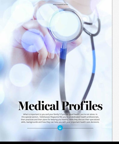 Medical Prof iles What is important to you and your family? If you say good health, you’re not alone. In this special section, Tallahassee Magazine fills you in on dedicated health professionals, their practices and their plans for keeping you healthy. Here they discuss their specialized skills, backgrounds and how they can help you with your important health care decisions.