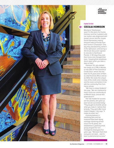 CECILIA HOMISON Moving to Tallahassee wasn’t in the plans for Cecilia Homison and her husband until her mother was diagnosed with breast cancer and the couple found themselves making frequent treks to Florida from their home in Charleston. One day they decided they weren’t in the right place, and during a 30-minute discussion agreed to relocate to Northwest Florida. In 90 days they sold their home and changed their lives, “showing that sometimes doors open when you take a step on faith.” Homison, 52, who started her career as a CPA in Atlanta, is now CEO of First Commerce Credit Union, where she has been for 15 years (nine of them as chief financial officer and six as CEO). She loves the uniqueness of the credit union industry and the close connection it has with the community First Commerce serves. “We have a unique footprint,” she says. “We are chartered to reach out to our community at a different level, and we feel good about it.” Her role models for success are her parents, who grew up poor but are successful today. “They taught me that life will be what you make it. I admire their tenacity. They went after it and made it happen,” she says. “It made me what I am.” A strong believer in mentoring (she and her husband have been doing marriage mentoring at their church for 10 years), she established a yearlong small group program for nonmanagerial employees five years ago. “We teach them that everyone can lead … and it’s been a phenomenal success.”