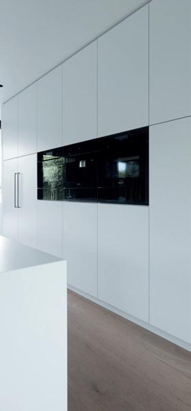 De lichte eikfineer komt als centraal thema terug in de strakke lattenwanden (waarvan 1 verzonken pivotdeur naar de bijkeuken) van keuken, living en gastentoilet. “Ook van de voorgestelde marmerlook keramiek werkbladen, in verstek verlijmd in het kookeiland, waren we direct verkocht!” vervolgt mevrouw Vereycken.