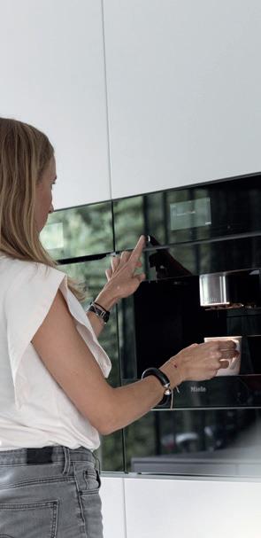 Het gastentoilet met handenwasser in modieus afgerond tablet en onderkast, is eveneens verborgen achter een lichte eikfineer deur, verzonken in eenzelfde strakke lattenwand in de vestiaire. “De speelse zitbank met spiegel vonden we een bijzonder leuk en handig detail,” beaamt mevrouw Vereycken,“maar ik werd pas echt blij bij het zien van de superruime wasplaats, met handige hangrekken en schabben. En voor mijn oude dag zijn de toestellen reeds op hoogte geplaatst.” Knipoogt Carine.