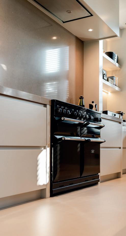 De familie De Rover uit Buggenhout was verkocht vanaf het eerste ontwerp. Wat startte als wens om de keuken na 15 jaar een totaal nieuwe look te geven, mondde uit in een totaalaanpak voor de gehele gelijkvloers. In de keuken valt meteen het robuuste gasfornuis op. Speelse accenten zoals de indirecte verlichting in de wijnglazen kast met ambachtelijk stalen glasdeuren geven in combinatie met de donkere kastenwanden in gerookte eik en onderkasten in satijnlak het geheel een warme look. Dezelfde stijl werd doorgetrokken naar de koffiecorner met wijnkoeler. Gezelligheid troef bij de familie De Rover. Zowel Pieter als Carine kunnen enorm genieten van een goed boek bij een glaasje wijn. De dubbele glazen deur in ambachtelijk staal geeft vanuit de inkomhal onmiddellijk een uitnodigende blik op de aangename zithoek met handige kastenwanden rond de gashaard.