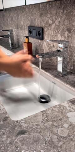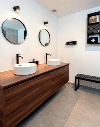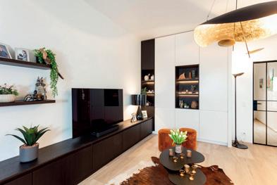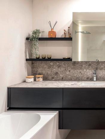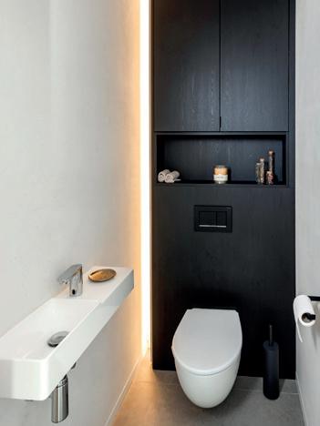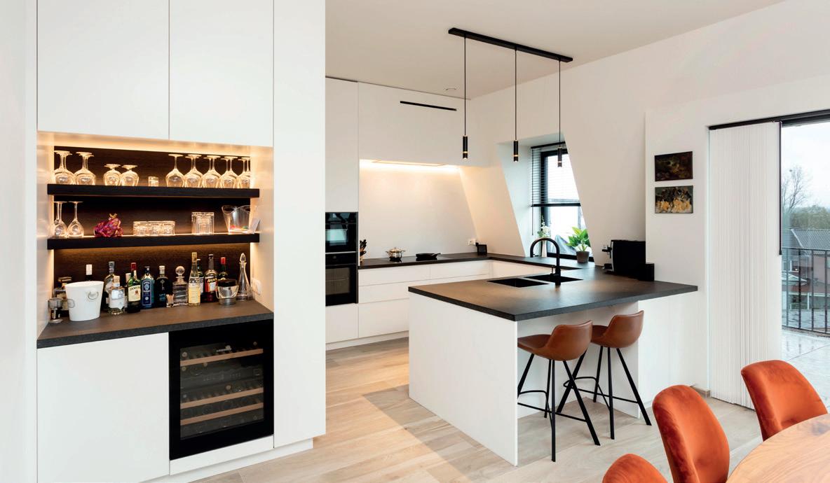 Voor elk wat wils! Het dakappartement van de familie Vangoetsem uit Balen (foto’s boven) moest bovenal strak, praktisch en gezellig zijn. De greeploze lakkeuken met een zwart granieten werkblad werd gecombineerd met een complete drinks-corner en wijnklimaatkast. Voor Louis en Caroline Deprez uit Kasterlee (foto’s rechts) lieten onze ontwerpers de zwarte maatkasten met een indirecte sfeerverlichting samenvallen met keramische werkbladen en goudkleurige accenten in de armaturen. Een tof samenspel dat harmonieus terugkomt in zowel de badkamer als in het gastentoilet.