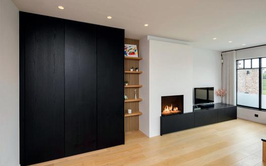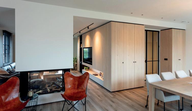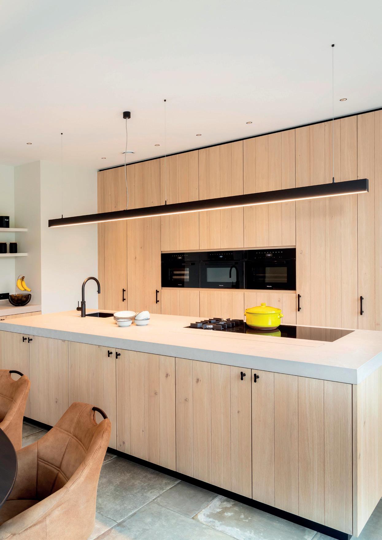 De familie Meskens uit Weelde koos voor een landelijk strakke stijl die van de open keuken tot het eet- en zitgedeelte werd doorgetrokken. De eikfineer lichtrustieke maatkasten leenden zich ook prima voor het tv-meubel en de verzonken gangdeur, mooi gecombineerd met zwarte accenten in alle grepen, verlichting en zwartgemoffelde stalen doorkijkdeur.