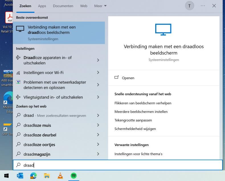 1. Ga naar de Beeldscherm instellingen in je computer (via je Windows logo > zoeken naar draadloos beeldscherm)