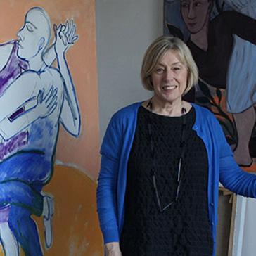 Containing both abstract and figurative elements, her painting is characterised by spontaneous painterly gesture, bold lines and an affecting use of colour.