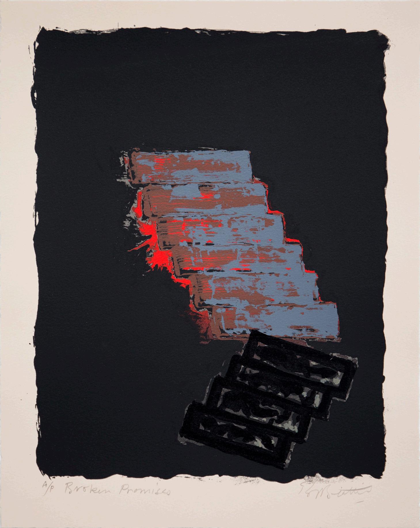 Broken Promises relates to a painting by Beattie of the same name and features his characteristic ‘stair’ motif. Beattie describes the image as having ‘psychological and emotional weight’, citing the landmark Abstract Expressionism exhibitions of the late 1950s, which profoundly influenced him at the time.