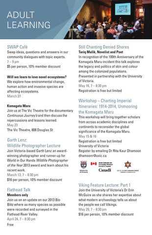 Will we learn to love novel ecosystems? We explore how environmental change, human action and invasive species are affecting ecosystems. March 27 Komagata Maru Join us at The Vic Theatre for the documentary Continuous Journey’s and then discuss the repercussions and lessons learned. May 23 The Vic Theatre, 808 Douglas St