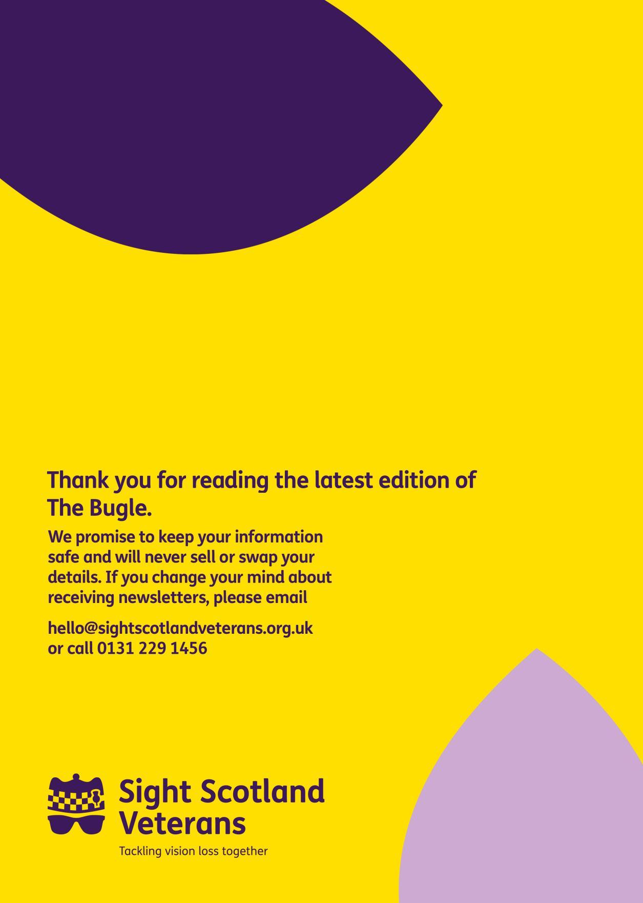 Phone: 0131 446 3099 Email: robert.steven@sightscotland.org.uk Post: Marketing, Sight Scotland Veterans, 2a Robertson Avenue, Edinburgh EH11 1PZ