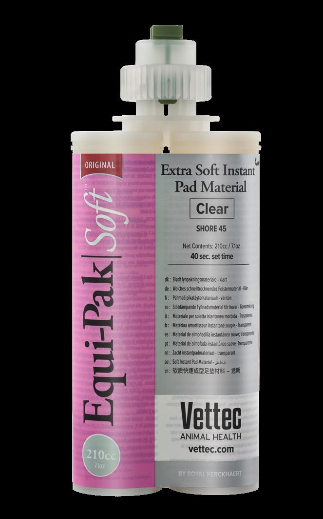Vettec Equi-Pak SOFT es un material de almohadilla más blando. Puede utilizarse en caballos con suelas finas y articulaciones óseas bajas. Equi-Pak SOFT es ideal para casos terapéuticos y está diseñado para su uso en combinación con plantillas.