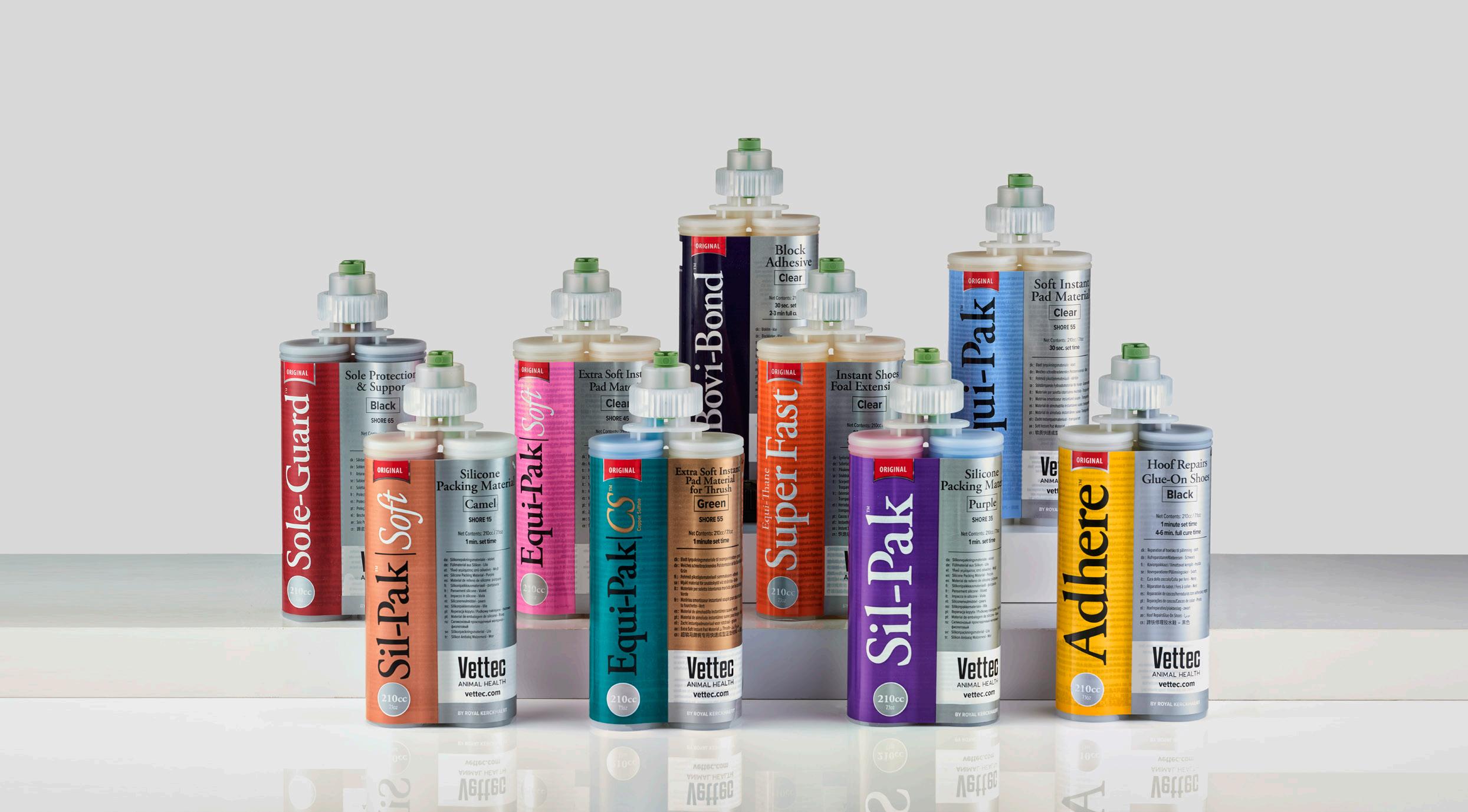Vettec Adhere puede utilizarse para reparaciones pequeñas y grandes de la pared del casco y para pegar herraduras. Se adhiere a plástico, acero y aluminio. Vettec Adhere es excelente para el pegado de herraduras y botas de uretano. Flexibilidad similar a la de los cascos. Posibilidad de clavar en el producto.