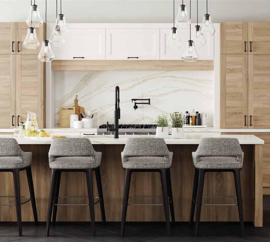 The door styles shown on these three pages are available in Full Overlay,which is our most popular styling option. With Full Overlay styling,doors and drawer fronts are sized to cover most of the cabinet face, leaving minimal space between adjacent doors.