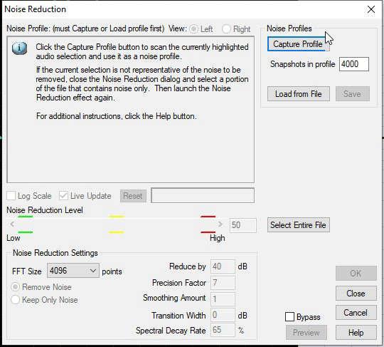 If you are satis ed apply the Noise Reduction to the whole waveform. A Tip. There is a risk that in applying Noise Reduction you will remove some of the audio frequencies that are part of the recording that you want to keep. Howard Gregory could spot this a mile off and called it the "Space Invaders" effect. To make sure you are not removing valuable stuff a good trick is to select a voice clip and apply the same Noise Reduction pro le to it, but select the "keep only noise" option. See Fig 6 (below).