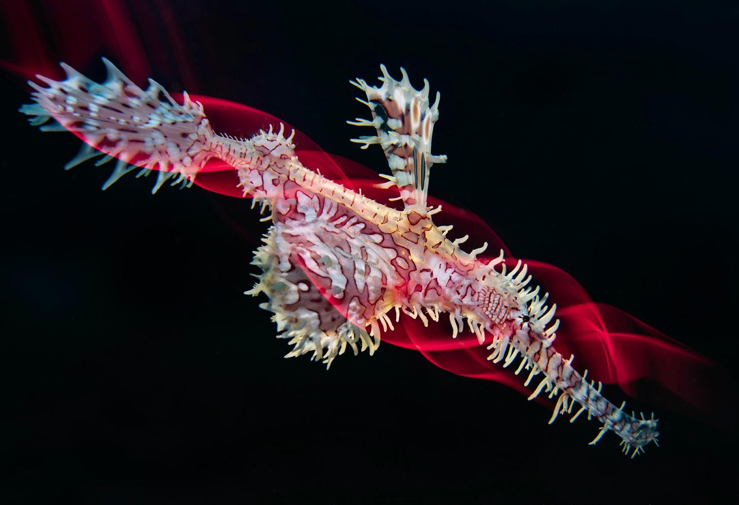 To achieve the helical shape around the seahorse, I spent a month at very shallow depths at the beach with camera and housing on a tripod, waving an empty bottle wrapped in wires in front of it. I did a lot of sessions in a pool as well. It is so meditative that you can create endless fun playing with ideas that do not have any boundaries. I experiment with anything - empty colourful shampoo bottles, keyrings, acrylic blades, EL wires.