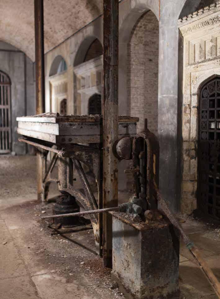 There are some 2,500 coffins stored in six aisles and 95 vaults off a central gallery. In the middle is an hydraulic catafalque designed by Bramah & Robinson dated 1839 which was used to transfer coffins from the chapel above down into the catacombs below.