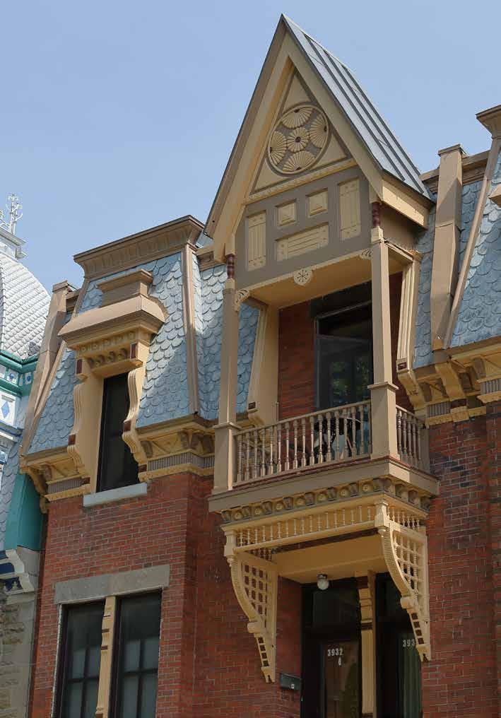 Photograph 4 An elegant mansard roof crowned by a lantern tower. Bold red accents and scalloped slate shingles frame three tall windows with sculpted surrounds — a rare example of artisanal detail preserved in Saint-Henri.