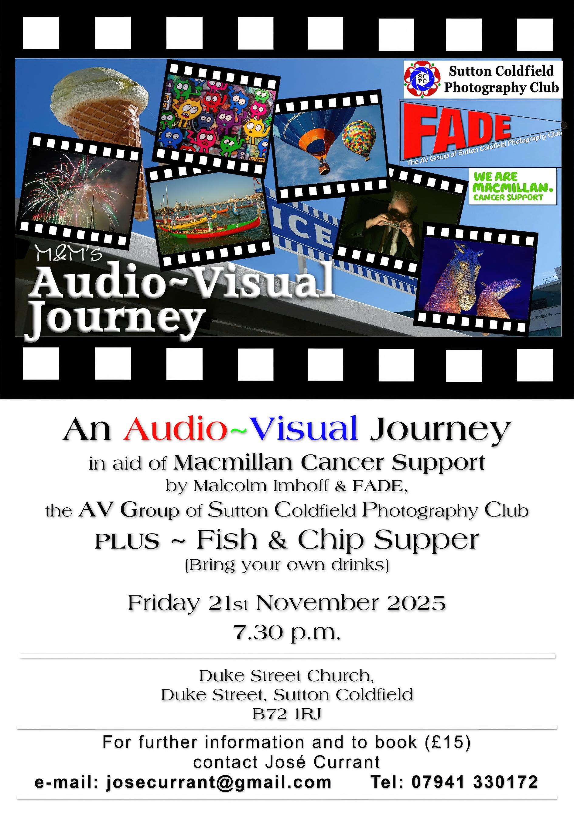 ʻAn Audio Visual Journeyʼ AV show in aid of Macmillan ‒ Arranged by Malcolm Imhoff. You need to book in advance with José Currantjosecurrant@gmail.com